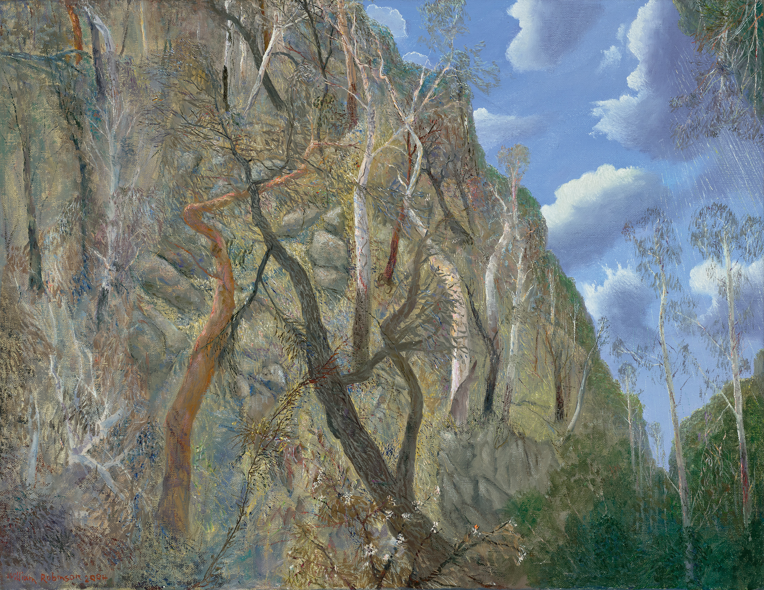 Robinson’s treatment of the horizon and distorted perspective set him apart from his contemporaries. While many Australian landscape painters traditionally looked towards the arid interior for inspiration, he embraces the lush south-eastern Queensland mountain ranges. The dramatic features of the granite belt, with its soaring cliffs, meandering rivers, creeks and waterfalls, offer the perfect subject for Robinson to flaunt his painterly innovations.