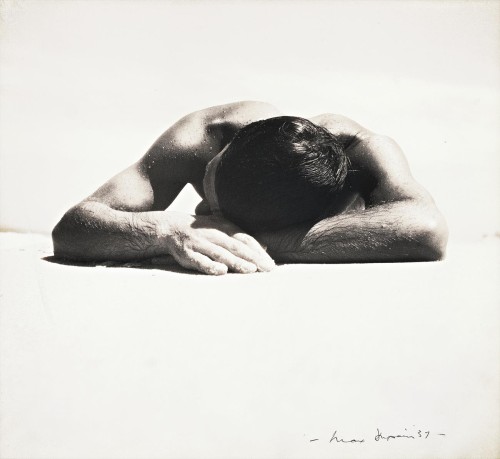 In formal terms, the composition of Sunbaker marked a departure from the artist’s earlier surrealist studio montages, which often featured full-length female nudes. Creating a visual correlation between the geometric solidity of a pyramid and the physical strength of a young man, Dupain’s photograph sits in a neat nexus between modernist formalism and an idealistic focus on physical wellbeing in the interwar years. This young man, with his bronzed skin and muscles glistening with salt, sand, sweat and seawater would come to embody the ideal antipodean (ironically, he was an Englishman who had recently emigrated to Australia). The subject does not call out to the viewer, encouraging them to emigrate to the idealised southern land of sunshine and good health, as he would have in contemporary advertisements. Instead, we as viewers, intrude on his intimacy and respite, the reduced form of his recumbent body jutting out into the foreground of the photograph, almost transcending the barrier of the picture plane. The austere simplicity and lack of spatial context of Dupain’s composition creates a timeless and universal space where man is at one with the land, resting on the horizon’s edge.