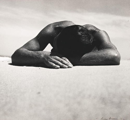 In formal terms, the composition of Sunbaker marked a departure from the artist’s earlier surrealist studio montages, which often featured full-length female nudes. Creating a visual correlation between the geometric solidity of a pyramid and the physical strength of a young man, Dupain’s photograph sits in a neat nexus between modernist formalism and an idealistic focus on physical wellbeing in the interwar years. This young man, with his bronzed skin and muscles glistening with salt, sand, sweat and seawater would come to embody the ideal antipodean (ironically, he was an Englishman who had recently emigrated to Australia). The subject does not call out to the viewer, encouraging them to emigrate to the idealised southern land of sunshine and good health, as he would have in contemporary advertisements. Instead, we as viewers, intrude on his intimacy and respite, the reduced form of his recumbent body jutting out into the foreground of the photograph, almost transcending the barrier of the picture plane. The austere simplicity and lack of spatial context of Dupain’s composition creates a timeless and universal space where man is at one with the land, resting on the horizon’s edge.