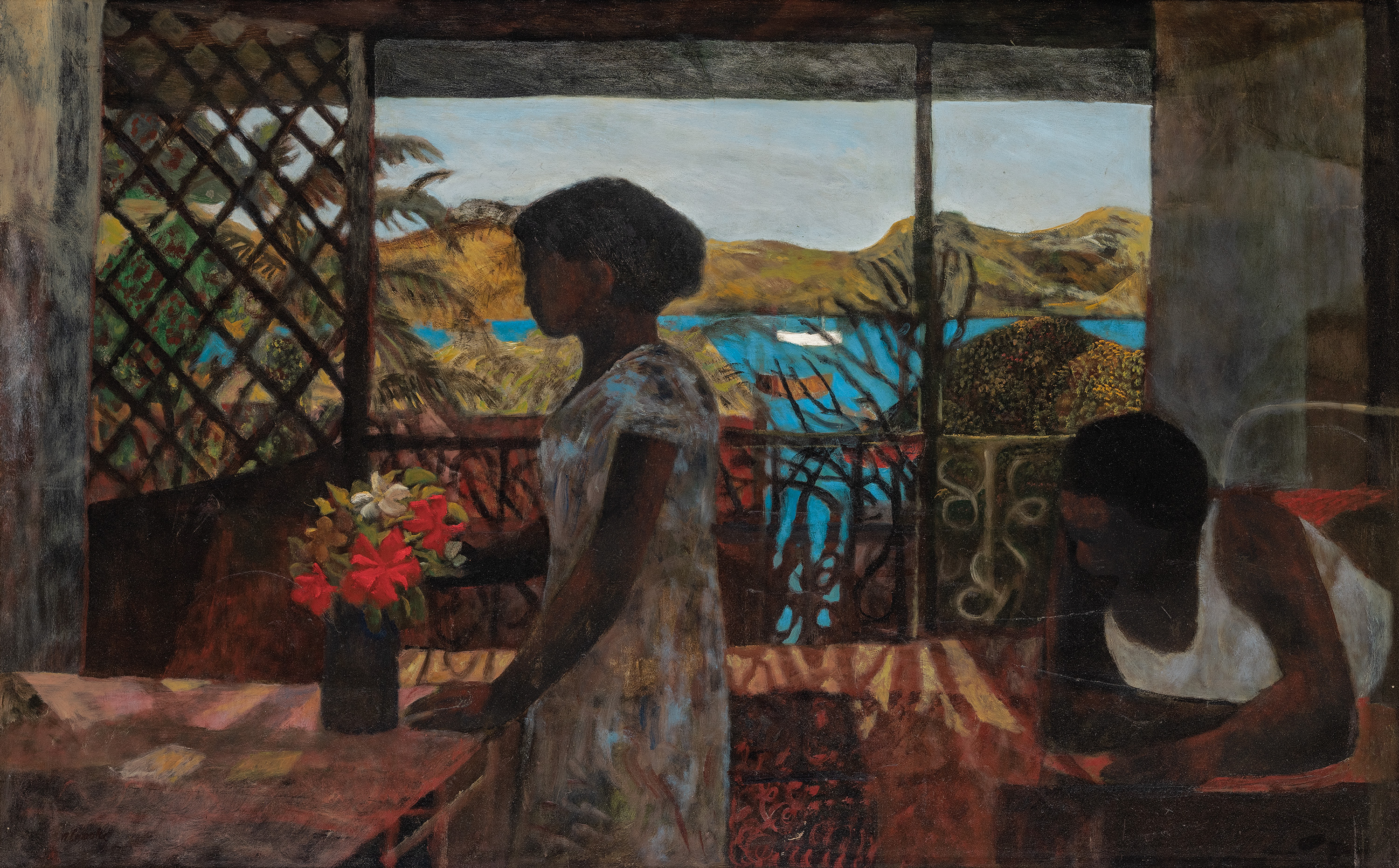 Fundamental to such conscious ordering of forms towards an aesthetic ideal is Crooke’s enduring preoccupation with tonal relationships, contours and silhouettes, and the dramatic juxtaposition of dark against light. Indeed, despite his richly decorative and highly developed sense of colour, one only need compare such tropical landscapes with those of his artistic predecessor, Paul Gauguin, to discern ‘the differences between an artist working through tone and one who worked through colour.’3 Underpinning the strength and authenticity of his vision, thus the image here is built up from a dark ground organised around tonal relationships to reveal a carefully constructed scene, with the two female protagonists bathed in the soft dappled sunshine that streams through the veranda from the sparkling harbour beyond. Imbuing the work with a powerful sense of mystery and curious timelessness, it is this sensation of clear defining light which gives stature to islander life and reveals Crooke’s abiding interest in the dignity of man. Betraying strong affinities with the art of Florentine Renaissance masters Giotto and Piero della Francesca in their quest to locate the eternal in the present moment – that point of intersection between time past and time to come – Crooke’s meditations accordingly invite his audience to experience the art of stillness, to appreciate the flow of time in its purest, most metaphysical sense. For, as James Gleeson astutely asserts, that ‘special kind of magic’ in Crooke’s paintings ‘only begins to work when one has discovered the stillness and the silence that lies at the heart of everything he paints... This stillness is not the mere stillness of arrested motion, but the projection of a mind preoccupied with deep and permanent things.’4