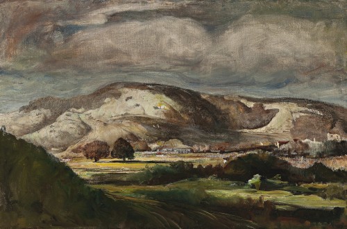 In Sunset on the Omega Hills, the ennoblement of landforms, echoed in the sky, evokes the heroic. The interplay of lights and darks summons the epic. The landscape is invested with an extraordinary humanizing feel, not so much by the signs of settlement, of houses and cultivated fields, but through the forms and folds of the land itself. A kind of interchangeable metamorphosis has taken place in the reflection of the human form in nature, her moods embraced by man as they become one. While Rees’ visits to the French and Italian countryside influenced him along his path to the civilized view, his own perceptions and passions raised his creativity to a new height. Of nature, Rees once wrote: ‘The artist’s symbols are mostly based on natural objects. But if his command over them is complete, he can evolve … by the simplest means, a pure creation of the human mind, an abstraction in precisely the same sense and degree as a work in architecture or music’.1