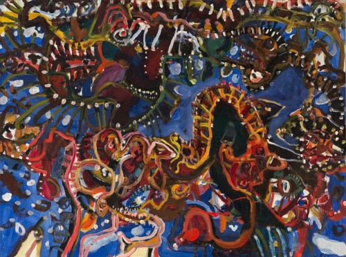 John Olsen embraces life with a gusto that is infectious. The hedonistic exuberance that distinguishes his art of this time, flows through such paintings of earthly delights as Half Past Six at the Fitzroy, 1963, in the collection of the Art Gallery of South Australia, Adelaide, and Entrance to the Sea Port of Desire, 1964, in the Art Gallery of New South Wales, Sydney, on into Sydney Nights, 1965. Bubbling over with enthusiasm, they seduce the eye through their metamorphic imagery, sinuous paint and colour, outlines of landforms and of those who inhabit them interchanging with unstoppable dynamism. Olsen was living in Victoria Street, Potts Point, then the centre of Sydney's thriving young art world. His unrivalled view of the Harbour with its ceaseless change provided constant inspiration for Sydney Nights and the other lively paintings of this series. They are so evocative you can hear the rowdiness of the pubs, feel the good life, and sense the mateship. As if to emphasize the point, Olsen morphed human profiles into headlands, a painterly gesture into a Luna Park. They are paintings supremely redolent of Australia of the sixties. Olsen's star was in brilliant ascendancy, as he focused on city and outback alike, be it the Entrance to the Siren City of the Rat Race or the 'You Beaut Country' series.1 In Sydney Nights and other like paintings, abstractly expressive landscapes of people and places teem with life " arterial lights and flashing signs, everything happening at once in homage to and celebration of the circus of living. Raw colours straight from the tube are set against sonorous deep blues to create celebratory pictorial metaphors of the moment. Only the aerial view can suffice to capture all with a calligraphic and pulsating sweep of paint.