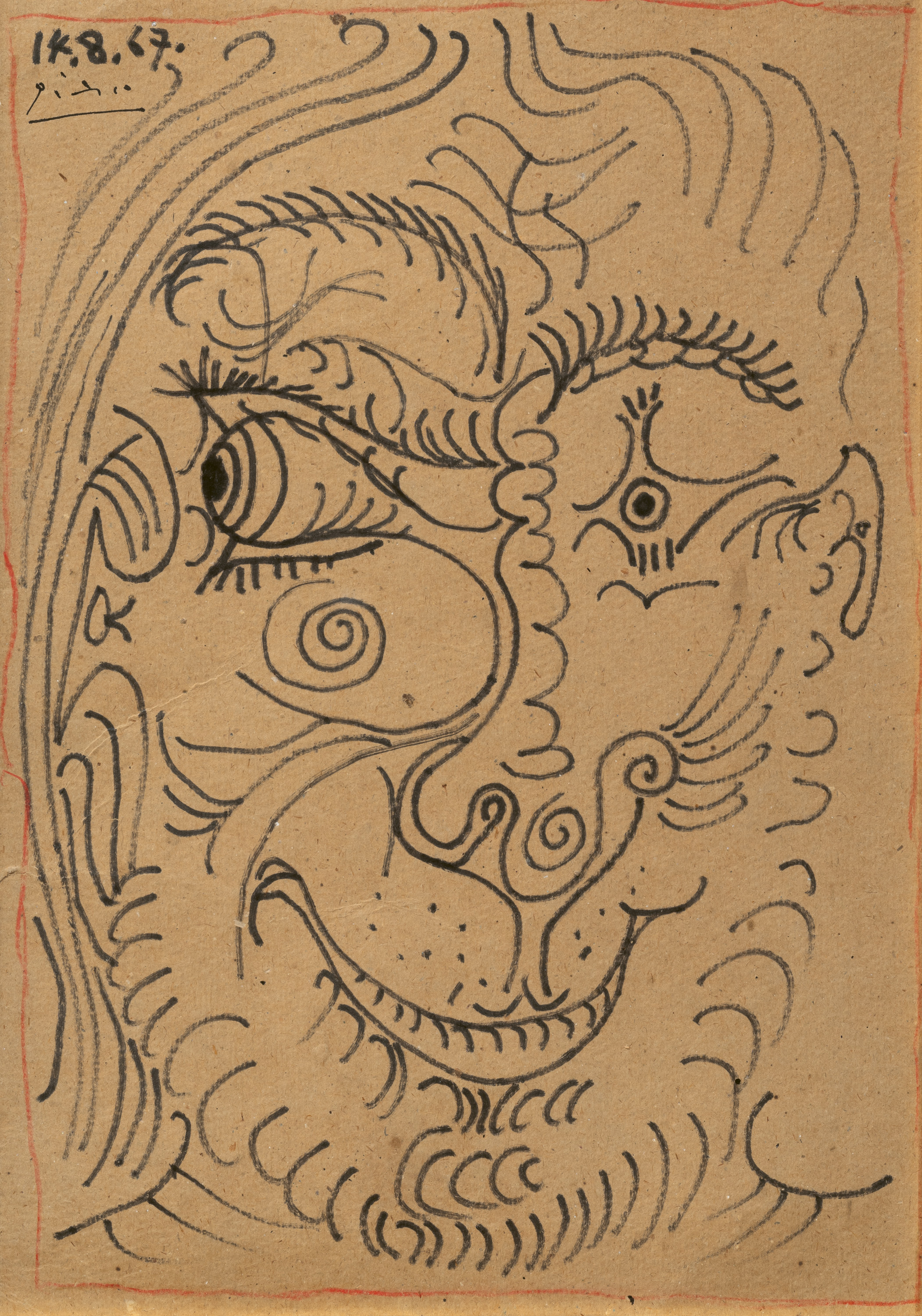 Although Picasso was never bearded, his swashbuckling avatars within these 1960s works featured a bushy beard, a broad flattened face and snub nose, concentric wrinkles and swirling eyes. A pockmarked upper lip and upraised nostrils give the impression of an animal muzzle, a slightly simian aspect. Mythological creatures appeared throughout Pablo Picasso’s oeuvre, the artist drawn to their playfulness and tragi-comedic narrative potential. With passionate intensity, the emphatic, repeated curved lines serve a dual purpose, evoking a hairy, leering Silenus figure, while also creating a hypnotic effect. Beyond the mask of charades and self-mocking caricature, Picasso presents himself (albeit metaphorically) with candour and humility, accepting the perils of his advancing age with an endearing and self-deprecating humour.