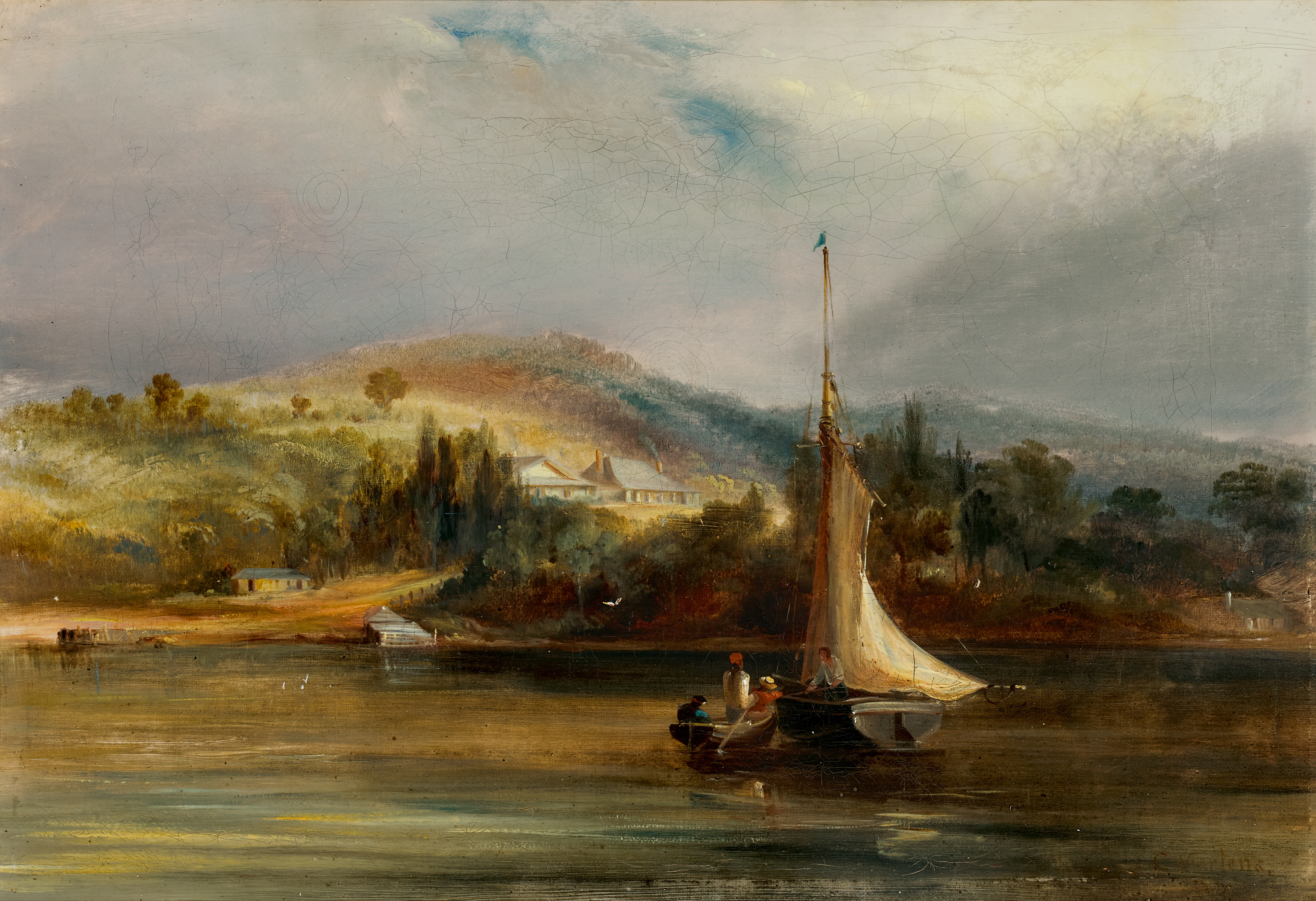 In 1841, Conrad Martens travelled north from Sydney to Newcastle and Port Stephens, seeking fresh scenery, new commissions and to visit Captain Phillip Parker King, noted hydrographer and recently appointed commissioner of the pastoral Australian Agricultural Company. Pencil sketches that Martens drew during this visit (now held in the State Library of New South Wales) informed two paintings commissioned by King of Tahlee, the elegant sandstone commissioner’s residence, comfortably situated above Nelson Bay at Port Stephens.1 As was usual in his practice, Martens manipulated atmospheric conditions as a compositional device; in this oil painting, the dark and shadowed native vegetation and storm clouds in the right half of the composition are interrupted by the vertical boat mast, while the sweep of the illuminated sail leads the eye towards the buildings, and the sunlit, cleared land and jetty at left.2