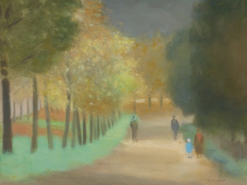 Beckett also had a deep understanding of Theosophy and in her paintings, the viewer is subtly aware of the artist herself, standing just out of frame, absorbing the scene in front of her and seeking its underlying spiritual pulse. The blossoming tree to the left in The Tan, South Yarra, and the long coats worn in spite of sunlit patches, indicate that she has captured an early spring day in this warmly inviting view. The painting also reveals Beckett’s skill in composition with its parallel rows of trees creating a vertical emphasis that establishes ‘a frame within a frame’. She utilised the same device in a number of works from the late 1920s, including Beach Road after the rain, c.1927 (National Gallery of Victoria), and Motorbike and sidecar, c.1928 (Warrnambool Art Gallery). After years of neglect, Beckett’s reputation has slowly been re-established in recent decades with the realisation now that she is one of the most significant Australian modernists of her day.