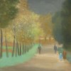 The Tan is a path that runs the circumference of the Royal Botanic Gardens in Melbourne. It was marked out in the early 1900s as a tanbark horse-riding track – hence the name – but by 1960, the rising costs of stabling and feeding horses near to the city meant that trainers went elsewhere.1 Over the next decades, it was transformed into its contemporary version resounding to the pounding feet of joggers marking time on digital clocks. In The Tan, South Yarra, (late 1920s), Clarice Beckett stood at a position on Linlithgow Avenue, adjacent to what is now the Myer Music Bowl, looking down the gentle incline to the curve that takes the track through to Alexandra Avenue. Painted on a commercial card support known as ’Beaver board’, the original study would have been executed on the spot, later finished into this consummate whole at the kitchen table of the Beckett family home in Beaumaris.