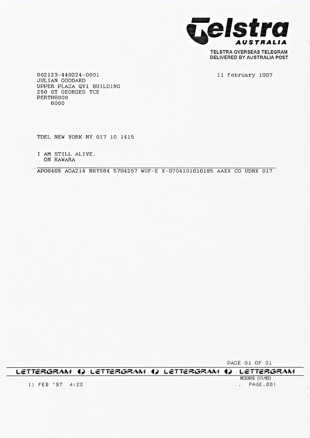 TELEGRAM TO JULIAN GODDARD, 11 FEBRUARY 1997, 1997 (I AM STILL ALIVE, 1970 – 2000 SERIES)
