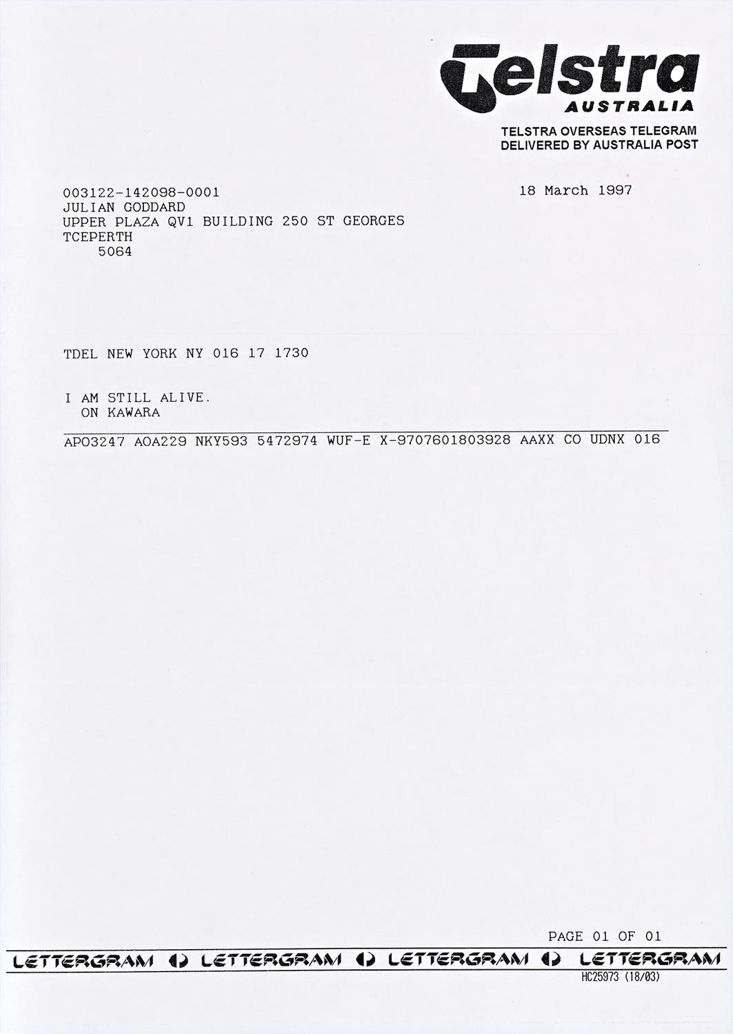TELEGRAM TO JULIAN GODDARD, 18 MARCH 1997, 1997 (I AM STILL ALIVE, 1970 – 2000 SERIES)