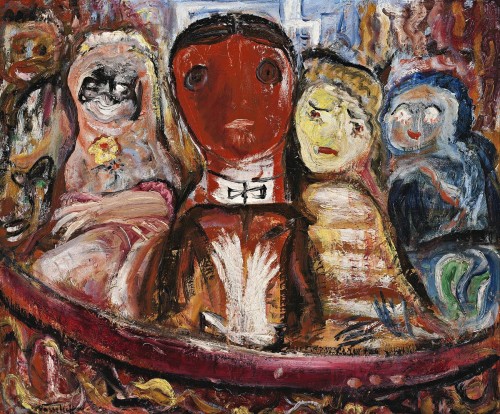 In Theatre Party, however, another side of Vassilieff is displayed, that of his tempestuous interactions with various female partners. Painted toward the end of one such relationship with Helen MacDonald, the artist has depicted his (suspected) rival sitting in a theatre box, lit from below by the stage lights in a manner reminiscent of Toulouse-Lautrec and Daumier. It is a grotesque apparition but fascinating nonetheless. Vassilieff’s hapless subject is rendered in urgent passages of paint with dandy-esque white gloves, alongside Helen and her ghost-faced companions, all portrayed as if the artist was desperate to get his emotions down in paint before they otherwise consumed him.