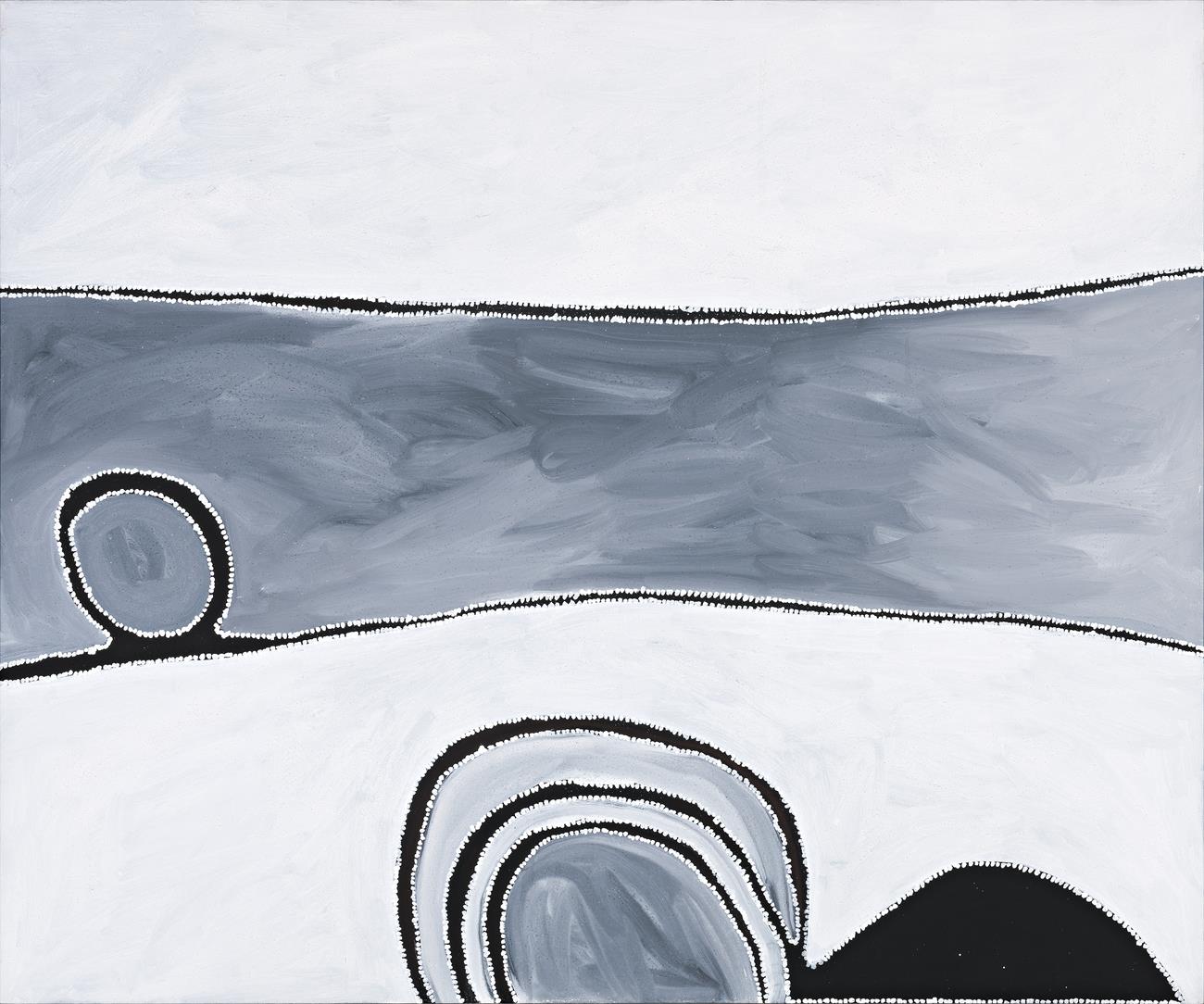 Executed in 2006 and catalogued as painting PB 6-2006-258 in the chronological index of Bedford’s works, this painting represents the country of Thoowoonggoonarrin, also known as Tunganary, located to the south of Bedford Downs in his mother’s country. Tunganary Gorge is home to a permanent waterhole and is the dreaming place for Thoowoonggoonarrin, a large tree with dark leaves that is related to the fig tree (Celtis philippinensis). The artist's maternal aunt died and is buried at this place. Thoowoonggoonarrin, 2006 was one of the last paintings executed by Bedford and can be seen as a culmination of the innovative changes in style and technique he developed to create his own representations of country. Here, large dominant forms along with the interplay between positive and negative space create a strikingly beautiful rendering of country. A sublime encrusted surface with washes of white and grey create a unique translucent quality, a consequence of the artist’s wet on wet painting technique. It is important to note that multiple narratives intertwine in Bedford’s paintings. Family stories, historical events and a deep connection to his country are often masked by the simple, bold starkness of his imagery and technique.