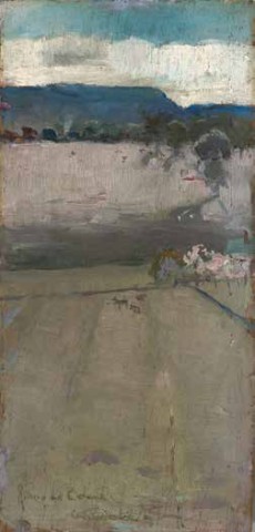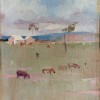 While our painting and the one in the National Gallery of Australia are inscribed ‘RIDDLES [sic] CREEK’, when exhibited in The 9 by 5 Impression Exhibition, the National Gallery’s painting was given the title ‘Riddell’s [sic.] Creek’ and our painting, ‘The Three Cows’. As noted by Mary Eagle in her book on Conder’s works in the National Gallery, both paintings have three cows, although they are more prominent in the latter. She also suggests that they ‘may have been painted on the same day’.9 If so, The Three Cows would have been first, as indicated by the light and other signs of the times of day. The absence of shadows suggests noontide and the cows graze happily in ordered line. The mood of pastoral peace continues through other images of settlement. Bright sunlight shines from the white-roofed, pink-walled homestead and dissipates the rain-bearing touches of grey on the cumulus clouds. Capturing the transient in paint, joy is characteristically touched by melancholy as sensuous pinks cohabit with fields of pale greens, all enlivened by the engaging movements of the brush and general upward movement. The fence line, reinforced by the distant hills of the horizon, divides the composition in two, almost equal, parts. All is balanced as quietude reigns in this vision of the poetic dreamer. The foreground is largely devoid of imagery, filled instead by subtle colour harmonies and the play of brushstrokes that speak of the visual pleasures found in abstract art.