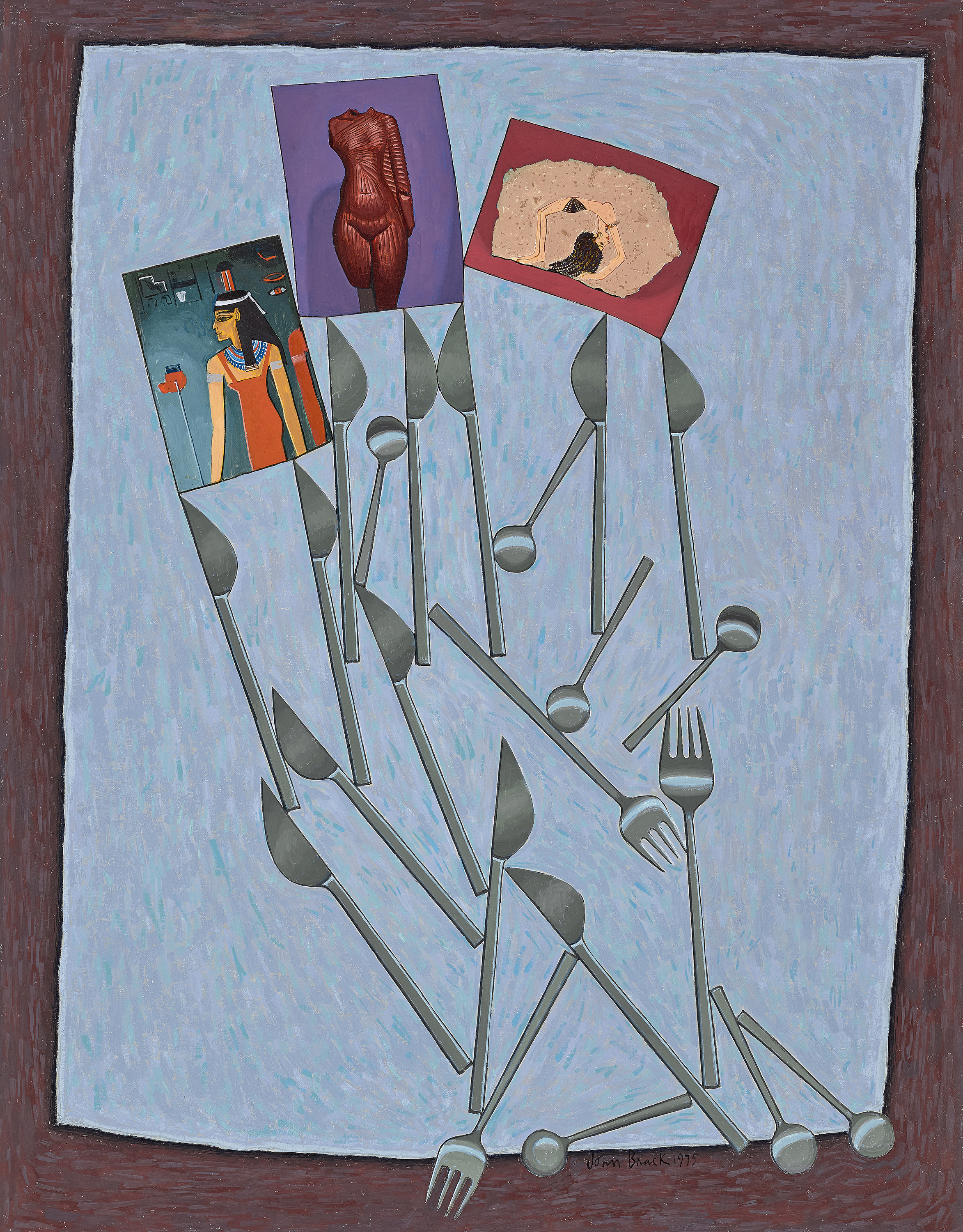 It took some time for the impact of Brack’s travels to emerge in his art, but when it did, a year or so later, his audience was confounded. The social commentary that had been such a consistent feature of his work was gone, as was the human figure. These elements were now replaced with precarious arrangements of cutlery, pencils and postcards depicting artworks and artefacts from ancient cultures, carefully reproduced in paint. Sandra McGrath typified the cool response of many to this new imagery, writing in the Australian newspaper that ‘Brack’s work celebrates an intellectual rather than an emotional approach to life and art. It’s a unique vision and puts him outside the mainstream of Australian art.’3