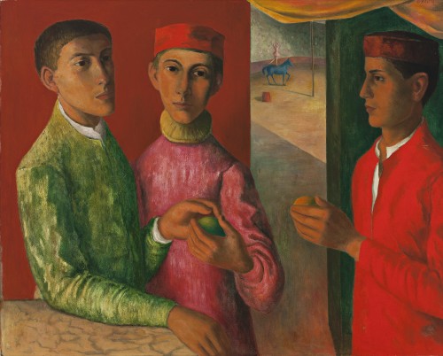 Standing statically in the foreground of the painting are three young men, their serious countenances incongruous within the circus setting. Seeming to have almost no interaction between themselves, these young boys are fixed in elegant poses with solemn and emotionally distant expressions. The young man in profile on the right hand side of the painting holds a pose that is common in devotional portraits of the Renaissance (often depicted on the exterior panels of a religious narrative painting) holding his hands in a position of prayer. His costume and appearance is similar to that of della Francesca’s portrait of the Duke of Urbino in Florence’s Uffizi museum. Within his hands is held a ball, while the other is passed between his two companions. These juggling balls create a tangible link between these three sitters, and a visual cue drawing the eye toward the modern circus scene in the background. Compositionally, the insertion of a window through which the viewer can glimpse the big-top, is a device often employed during the Renaissance, the painting-within-a-painting creating an extension of the natural world to heighten the realism of the scene in the foreground.
