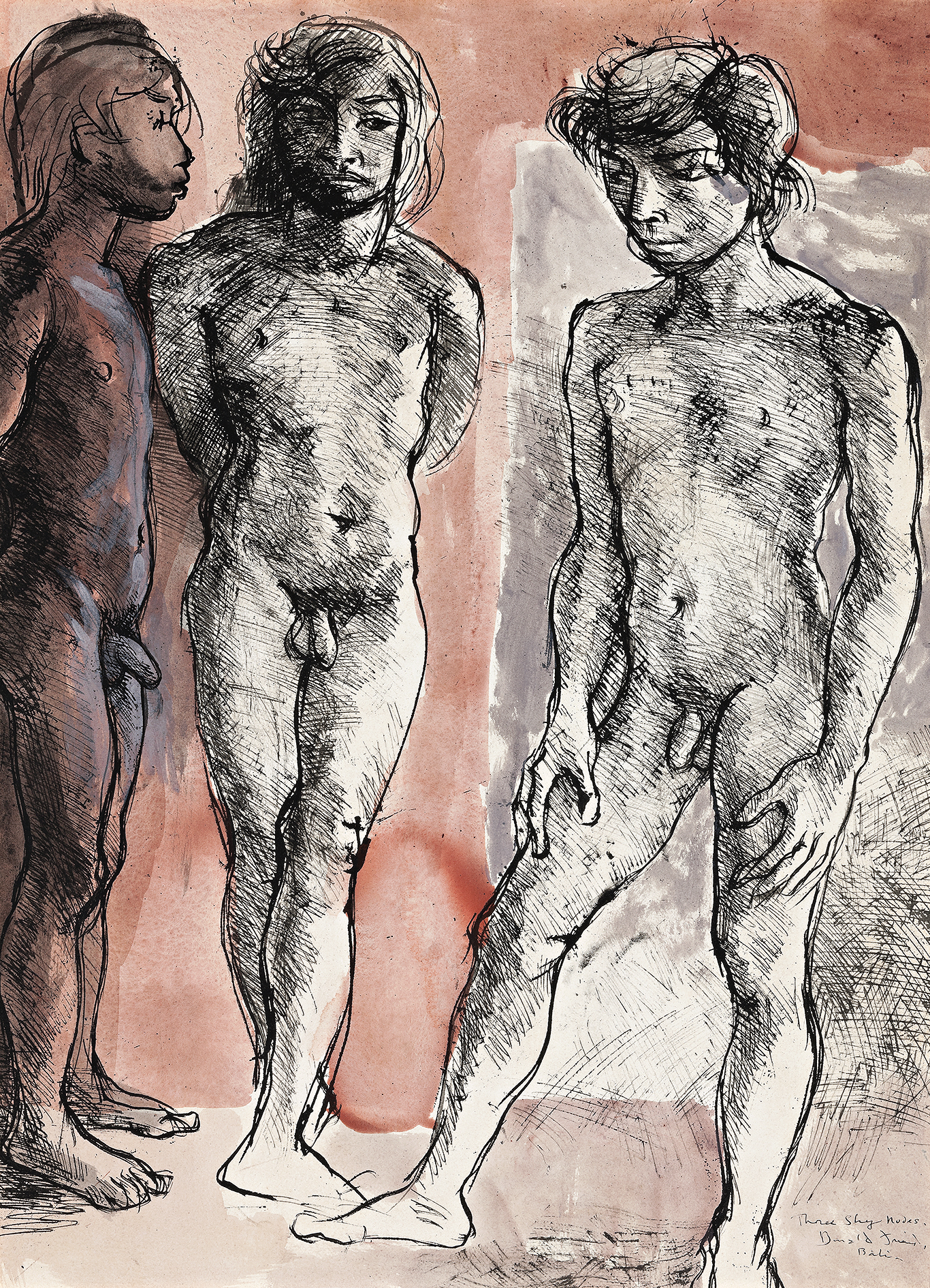 signed and inscribed with title lower right: Three Shy Nudes. / Donald Friend / Bali