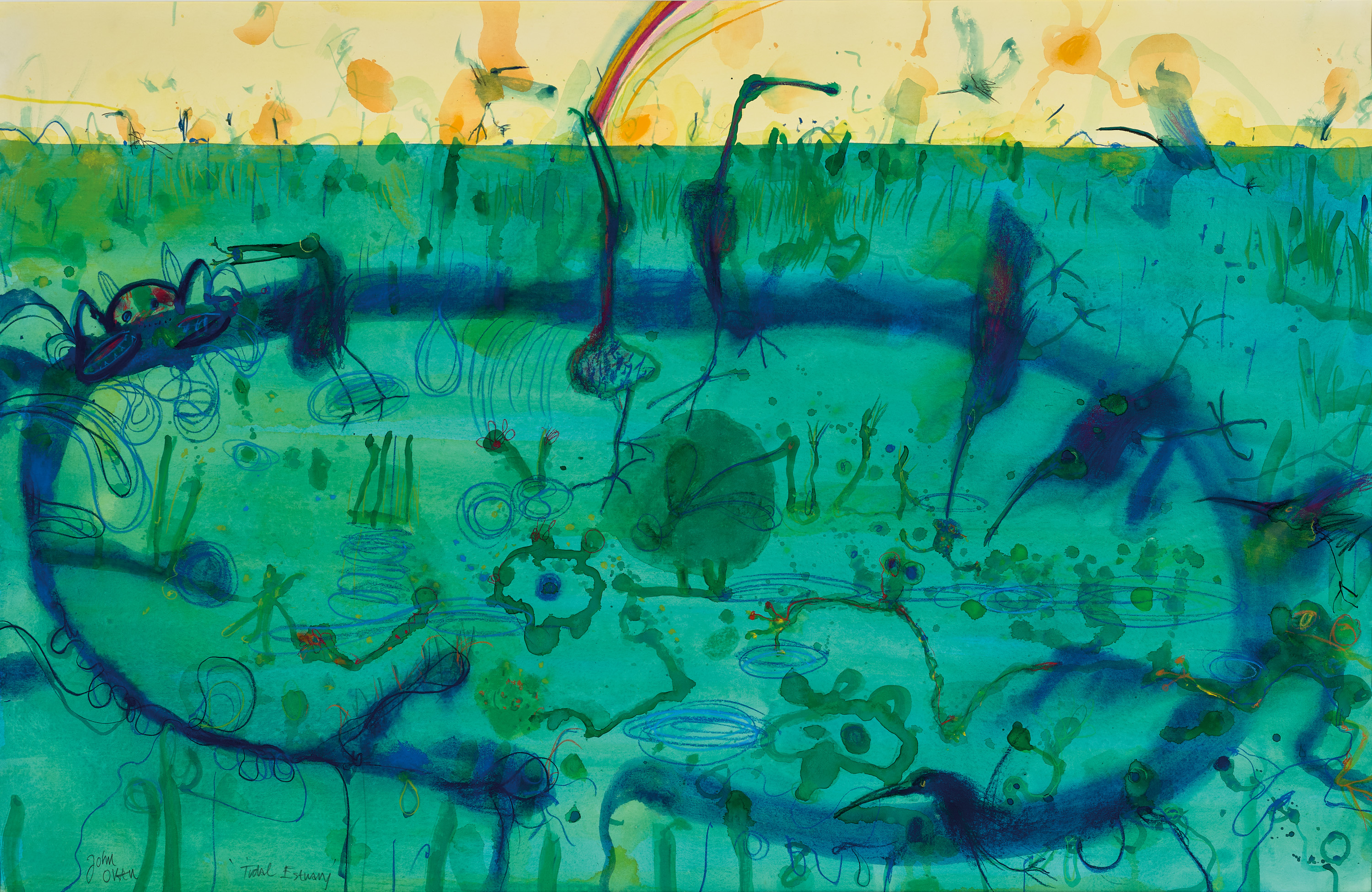 signed and inscribed with title lower left: John / Olsen / ‘Tidal Estuary’