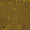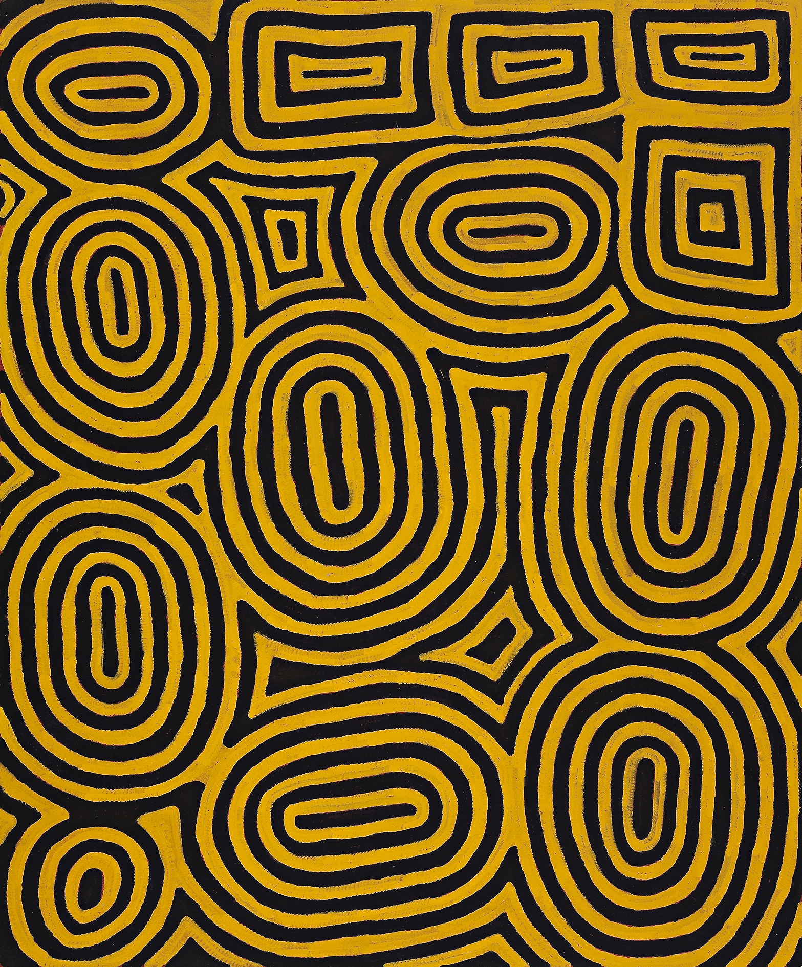 Reductive in its composition, Tingari Cycle, 1997 epitomises well Tjampitjinpa’s approach. Large simplified roundels, the product of two decades of refinement, collide and push against one another creating tension that reinforces the power of the Tingari. To the top right the standard circular roundels have been replaced with squared elements, and the minimal palette of contrasting black and yellow hues further simplify and intensify the composition.
