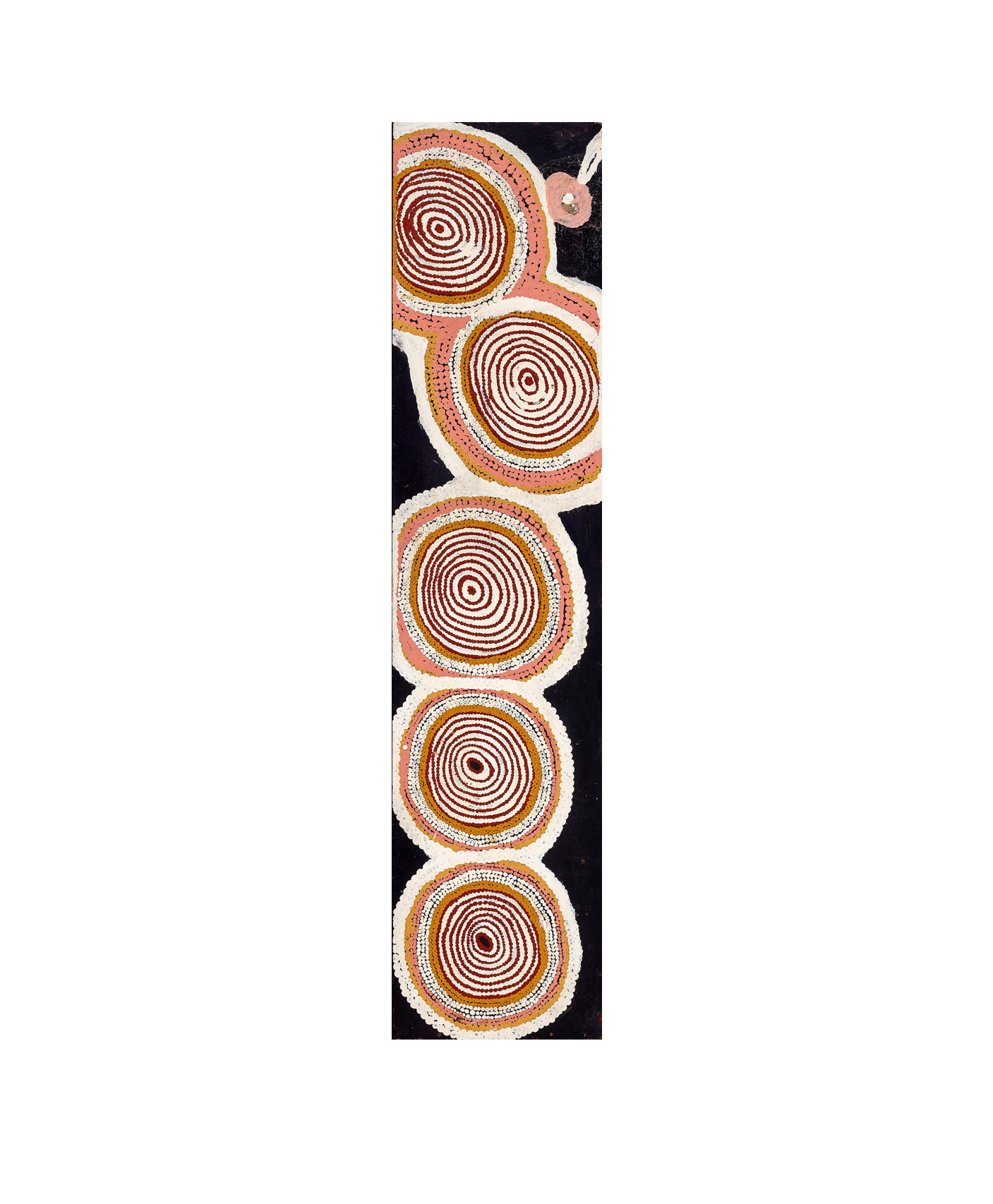 This work is accompanied by a certificate of authenticity from Papunya Tula Artists, Alice Springs which states: ‘In a fascinating traditional design of concentric circles almost haptic in concept, the artist has depicted the Tingari Cycle associated with the travels of the Tingari ancestors west of Nyirripi. The roundels represent water soakages where the Tingari stopped to rest and drink during their long journey.’