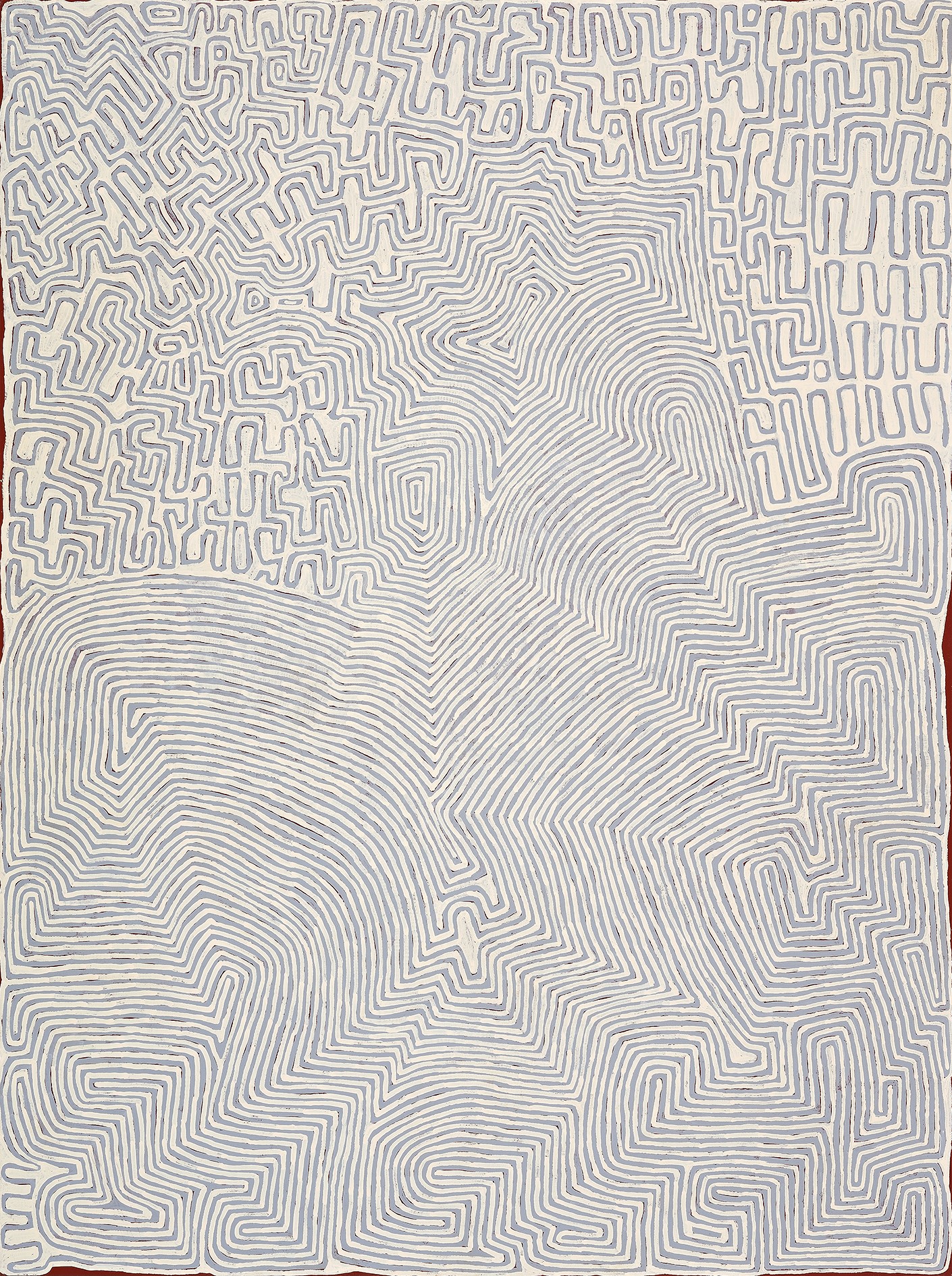 This painting is accompanied by a certificate of authenticity from Papunya Tula Artists that states: ‘This painting depicts body paint designs associated with a Water Dreaming at the Tingari site of Watanuma, north-west of the Kintore community. In ancestral times, two snakes travelled to this site from the east, only to find there was no water there. The lightning at the site wanted the snakes to leave the area so began spearing the ground. This caused the snakes to burrow deep into the ground which then created a large clay pan and soakages which remain today.