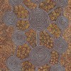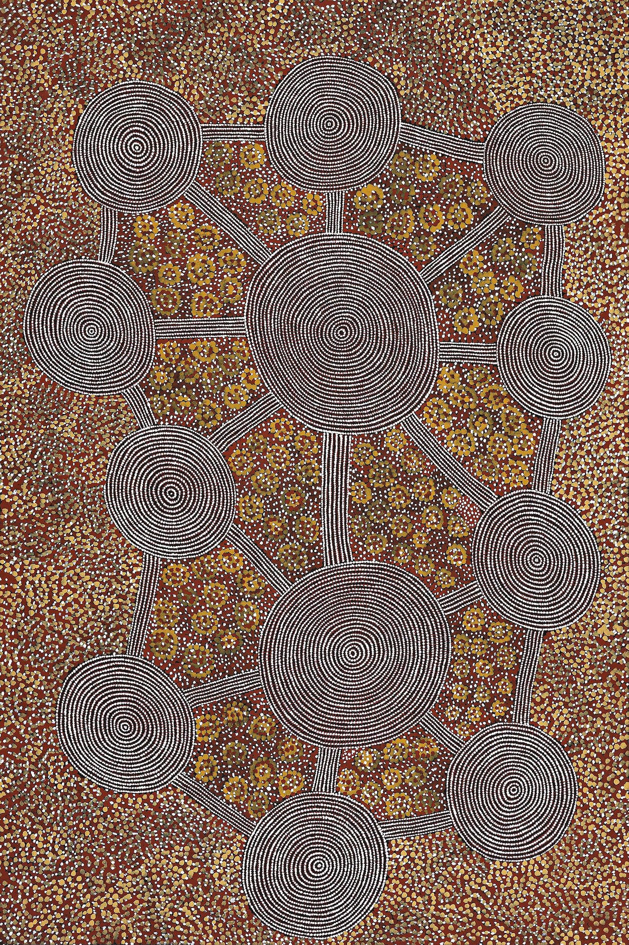An exemplary practitioner of the classical Tingari motif, Anatjari here features roundels composed of up to twenty-three perfectly executed concentric circles, whose precision and amplitude is intended to convey the authority with which Anatjari approaches his subject. The rigorous austerity of the Tingari design is softened by the lightness of dotted florets, hovering within a (ceremonial) space, delineated by the interconnected site-path motif – a pattern signifying the abundance of the bush fruit Yawalyurru, the growth of which is promoted by the performance of ceremony at this site.