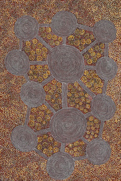 Anatjari has encoded the events at Yawalyurru within a constellation of interconnected concentric circles. The icon simultaneously represents the paths of Kuninka and the Tingari at Yawalyurru, and the body paint of the performers who re-enact these events in contemporary post-initiatory ceremonies.