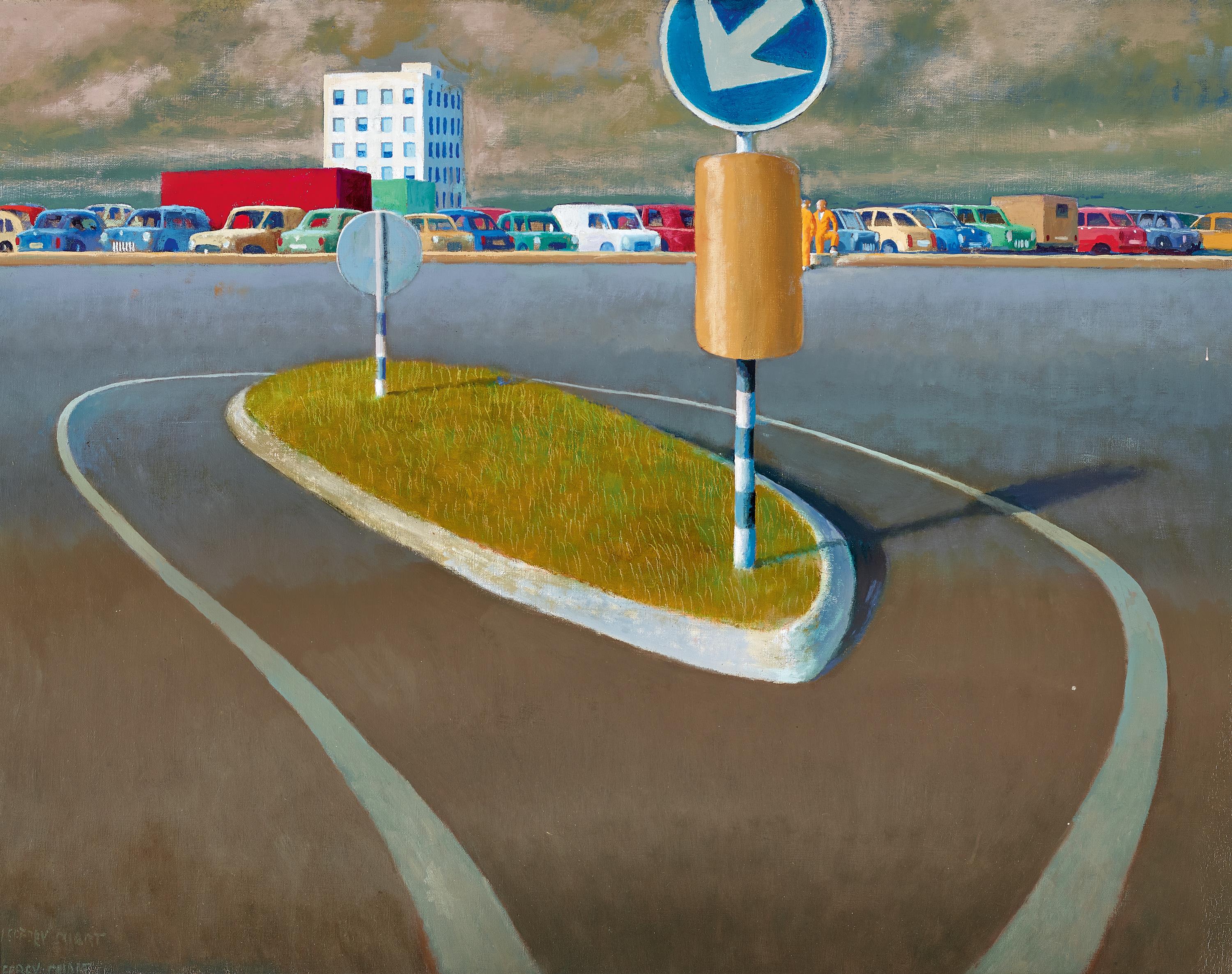 Although it is tempting to read Smart’s works as critiques of urban alienation, as an evocation of Hopper-esque modern solitude, this wouldn’t give due credit to the wry humour encased within his compositions. Roads, in life like in Smart’s paintings, are carefully engineered and clearly delineated, herding the hidden hordes of citizens throughout space. Smart’s Italian autostrade are not formed by the intuitive and repetitive motions of desire paths; they efficiently direct the lonely viewer (motorist?) through the composition with precise instructions. A contradiction lies in this implied movement of the viewer and the hushed stillness of the freshly empty scene before them. The arrow indicates a direction in which the motorist/viewer should keep moving, circumnavigating this traffic island with no clear exit in sight. On the horizon, a hedge of tightly packed parked cars taunts with the promise of respite in the form of an unattainable parking spot.