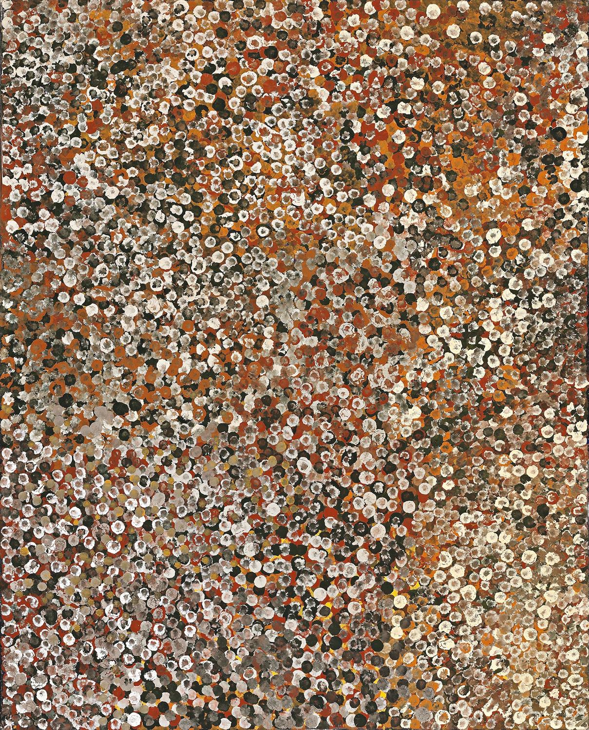 Painted during a build up before a storm and completed as the rain was very imminent, Transition, 1990 was included in the exhibition Crossing Cultures: Art from the Boxer Collection, held at the Australian National University Drill Hall Gallery in Canberra in 2000. This painting is prescient of her later 1992 paintings in which Emily swapped her small brush and technique of overlaid clouds of dots, for a larger brush that produced floret shaped marks. By using a larger brush and ‘double dipping’, she produced florets of colour by bringing the brush down vertically on the canvas, then lifting it off with a twist.1 This work however belongs very much in that early period with the marks spreading right to the edges of the whole canvas and the restricted palette also very characteristic of Emily’s early tonal works. Painted over a dark grey ground and overlaid with sequences of florets of red, yellow and orange built up through rhythmic application, and topped further with florets of white, grey and black – suggesting the first splashes of rain on the parched desert - this painting anticipates the post rain transition from barren to lush and fertile.