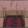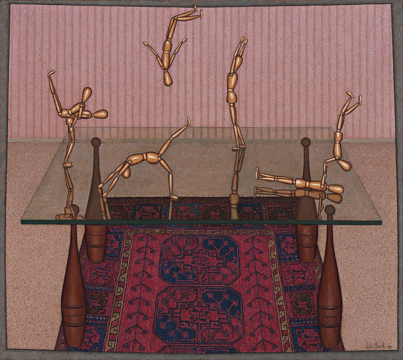 Brack turned seventy in 1990 and many of the works made around this time show the artist reflecting on his own experience of life as well as looking forward. As Helen Brack recalled, ‘John was getting older, and so he was starting to think of the future – not his future but the future … (He realised) that it was the same again – we’d very much seen this, been there. That was the beginning of his making an image for perpetuation … There is an optimism at the end of John’s life that wasn’t there earlier’.3 In this context the acrobatic manikins that leap and somersault across the picture in Tumblers, 1990 reflect the carefree confidence, energy and freedom of youth. Their placement on a sheet of glass resting on wooden juggling pins introduces an unsettling note however, highlighting the precariousness of the situation and the critical role that each figure plays in maintaining balance and flow. How better to depict the interdependence of individuals within any community? Pictured in an enclosed domestic space against a backdrop of subdued striped wallpaper and flecked carpet, the scene is at once intimate and familiar while the intricate pattern and strong colour of the Persian carpet (an often-used motif in Brack’s work from the 1950s on) pushes it out into the world making it an image and associated lesson that is relevant to all.