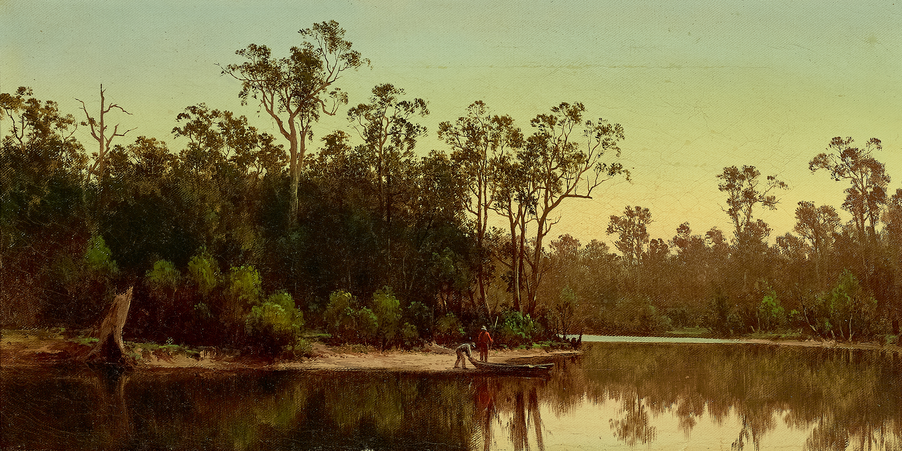 In nineteenth-century Australia, the marriage of photography and painting reached fascinating heights - perhaps none greater than those achieved by British-born H.J. Johnstone. Drawn to Australia by gold, his popularity grew through his fashionable photographic studio on Melbourne’s Bourke Street, together with his nationalistic landscapes and flamboyant personality. Exhibiting with the Victorian Academy of Arts from 1872, he was inclined to paint looking into the light, especially sunsets – captured with awe-inspiring realism, stillness echoed in mirrored images and gums silhouetted in grandeur. Johnstone’s related work, Evening Shadows, Backwater of the Murray, 1880, was the first painting acquired by the Art Gallery of South Australia in 1881.