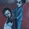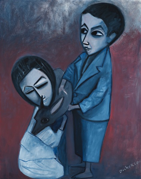 Two Children with a Fawn, 1971, contains many of the hallmarks of Robert Dickerson’s classic works. There is the motif of the embrace, the presence of children and the restricted palette that heavily utilises the dusky richness of blues and the strong, clear brushstrokes delineating the figures are painted with an assured confidence. The artist’s distinctive self-taught stylisation was resolved within his early works and was maintained throughout his career. His unwavering dedication to simplicity and directness of composition allowed space for painterly nuance and concentrated a palpable presence within his subjects. Robert Hughes wrote in succinct appreciation ‘the emotional power of some Dickersons – particularly those painted between 1954 and 1959 – is undeniable. Their laconic drawing controls the very dramatic situations they describe.’1