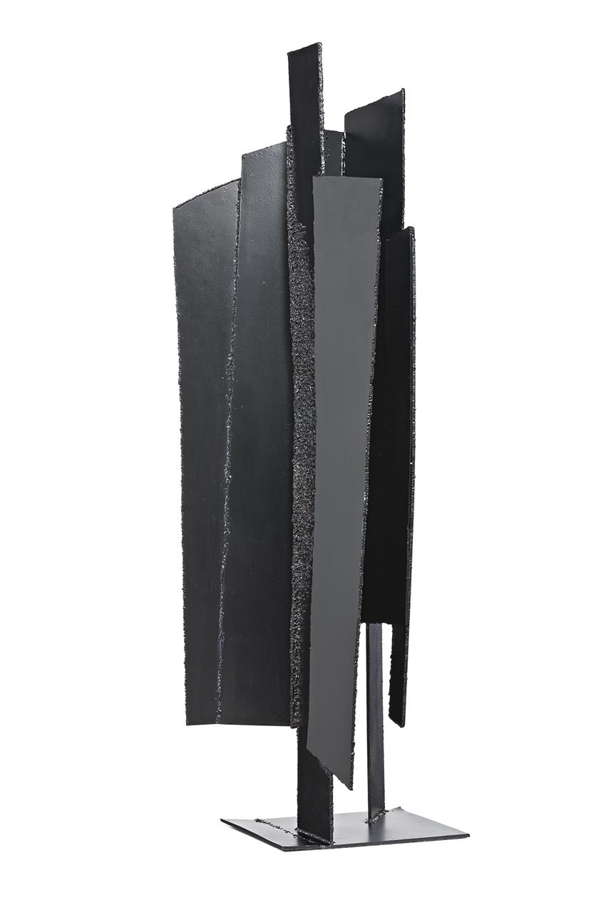 Inspired by the work of her Melburnian peer, Lenton Parr, Inge King took up welding in 1959. Facing not insignificant public hostility to sculpture as well as a local cultural climate sceptical about abstract art, King nevertheless used this new skill to translate the liberated gestures of Abstract Expressionism into three dimensions. Edward Lucie-Smith, in his survey of modern sculpture, was careful to note that this new expressionist style was executed by sculptors with greater difficulty than it had been by painters.2 As her welding skills developed, King sought out techniques beyond her primary need to join multiple planes of sheet metal, and instead looked for ways of creating visually interesting texture. Unfolding Form (Maquette) exemplifies this achievement, in spite of its marked restriction of formal means. Balancing vertical and horizontal tension, the visibility of each plane of Unfolding Form (Maquette) relies on the contrast between smooth cut surface and raised beads of molten steel, lying along the edges of each sheet and in the recesses between them. It is through these surprising embellishments and juxtapositions that we feel the presence of the late artist – having left clear traces of her hand burnt into the metal with a fierce oxy-acetylene flame.