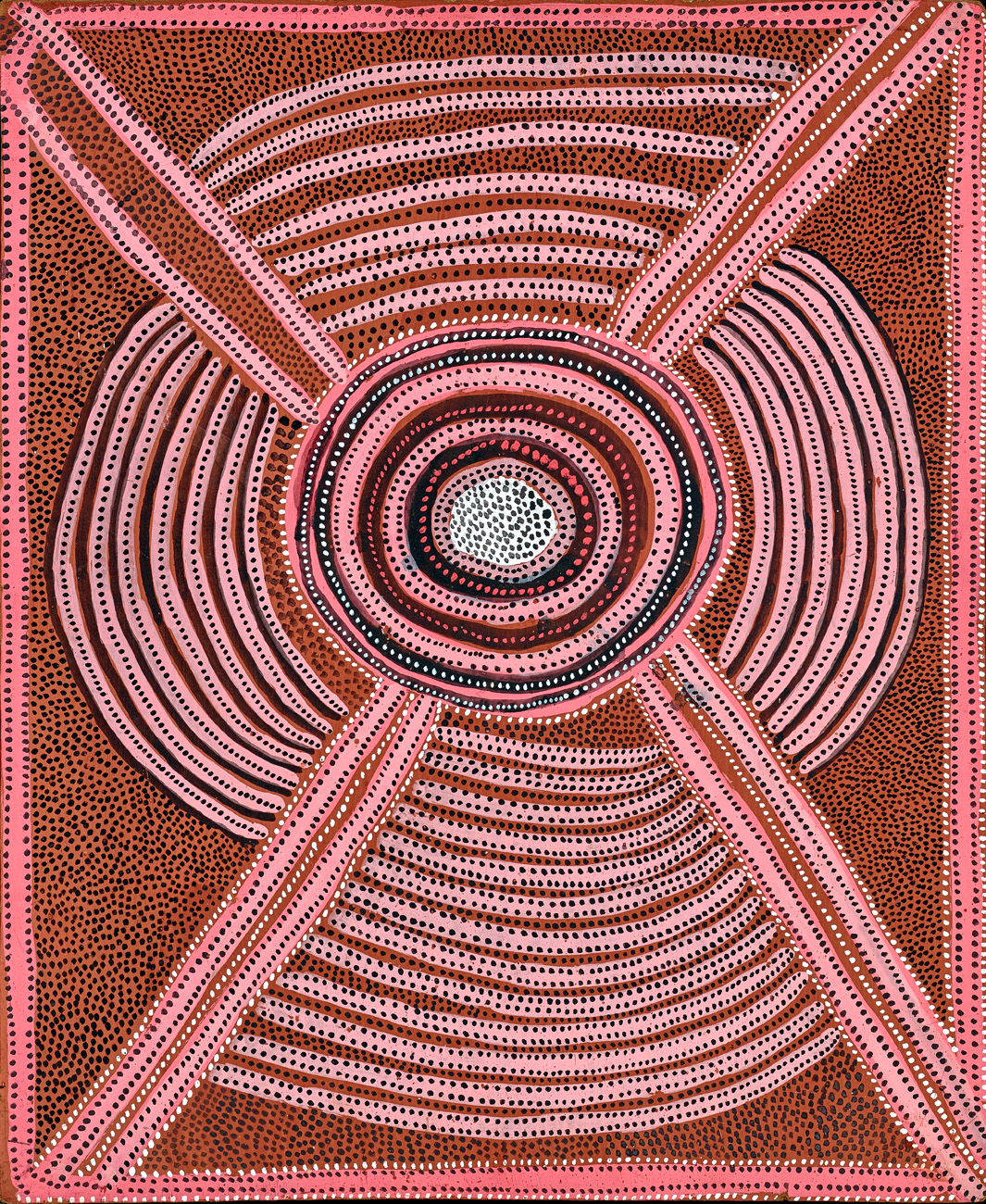 This intriguing work by one of the doyens of the original Western Desert painting movement has been separated from its original documentation. The composition of the image and the palette bear comparison, however, to a number of paintings from the 1970s by Namarari that relate to the sun, the moon and the element of wind. The paintings in this group all feature a compositional structure based around a dominant central roundel from which emanate rays or lines in a symmetrical pattern to the corners of the picture plane.