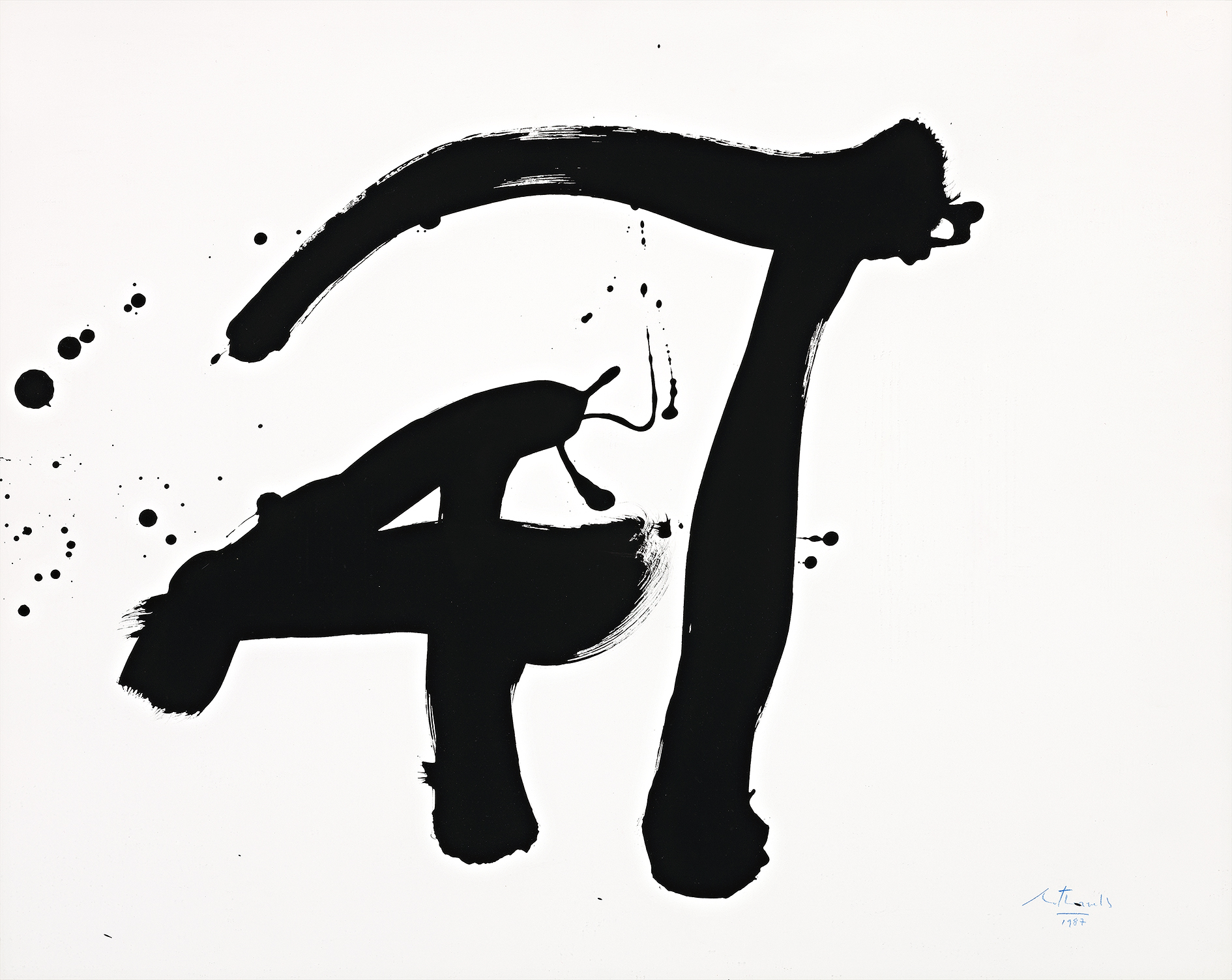 Unlike many of his fellow Abstract Expressionists whose lives and success burned brightly but for far too short a time, Motherwell enjoyed a long and highly acclaimed career spanning almost five decades in which he continued to investigate and expand upon these seminal ideas through his painting, writing and lectures. With its stark black and white palette, Untitled 1987 dates from Motherwell’s final years, yet nevertheless betrays unmistakable stylistic affinities to his earlier signature series – Elegies to the Spanish Republic – comprising over 140 paintings in which he expresses nostalgia for the lost cause of the Spanish Civil War, lamenting the human tragedies of oppression and injustice. Unlike the solemn brutality of his Elegies however, the present work reveals an elegance and lyricism in the spontaneous abstract ‘splash’ – a gesture which not only evokes the Chinese and Japanese calligraphy that Motherwell admired and collected, but equally, echoes the linear forms of Spanish surrealist Joan Miro and the strident black and white compositions of American contemporary Franz Kline. Indeed, unifying the formal concerns of European modernism with the more spontaneous, emotionally expressive methods of the Abstract expressionist movement, the work encapsulates superbly Motherwell’s thesis that ‘…Every intelligent painter carries the whole culture of modern painting in his head. It is his real subject, of which everything he paints is both an homage and a critique, and everything he says is a gloss.’2