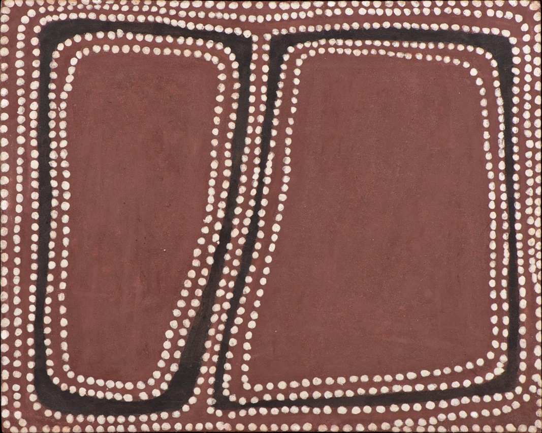 The subject matter for this painting is most likely the Wati Kutjara, the story of the ancestral travels of two men, ubiquitous in the mythology of the Western Desert. A prominent story related to the Tingari ancestors who, in mythological times, moved across the land creating sacred sites and giving people law and culture and whose influence spread from the central to the western deserts and into the Kimberley. The Wati Kutjara story has connections to Rover Thomas’ place of birth at Kunawarritji (Well 33) on the Canning Stock Route in the Tanami Desert and is the subject of a number of Thomas' paintings.