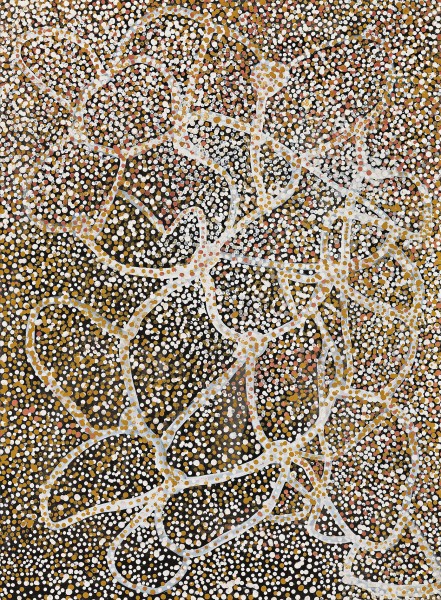 Untitled is an early painting that links both the freely formed lineal expression of the Atnulare Yam structure with the likely path of either food gatherers or the male emu with chicks moving across country. Her brush passes over, and is contained within the canvas surface, largely guided by her early experiences when gathering food. The lineal structure is determined by the spread, or growth pattern, of the yam vine, its tuber, and nutritious flower seed, and other accompanying species of the locale at various stages of maturity. Her line is also guided by memories of times when immediate circumstances such as distance from water and shelter, or evidence of predators threatening the emu chicks were present.
