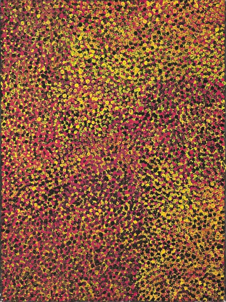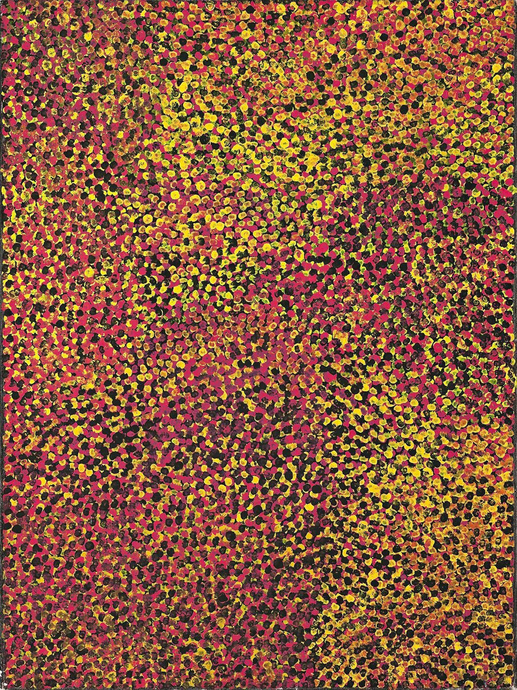 Significantly, Untitled, 1991 was created at a time when Kngwarreye’s painting was itself undergoing a process of transformation, with the artist abandoning the background tracery of the underlying yam roots and emu tracks, a consistent compositional device in her earlier paintings, and transitioning instead into fields of pure dots. This was also a time when Kngwarreye experimented with colour and broadened her palette beyond traditional colours and their derivatives, to incorporate brighter hues such as blue, green, and in this case, vivid reds and yellows. Kngwarreye suggests not only a sense of delight in the colours of the landscape; rather, now colour itself becomes both the impetus for – and subject of – such paintings.