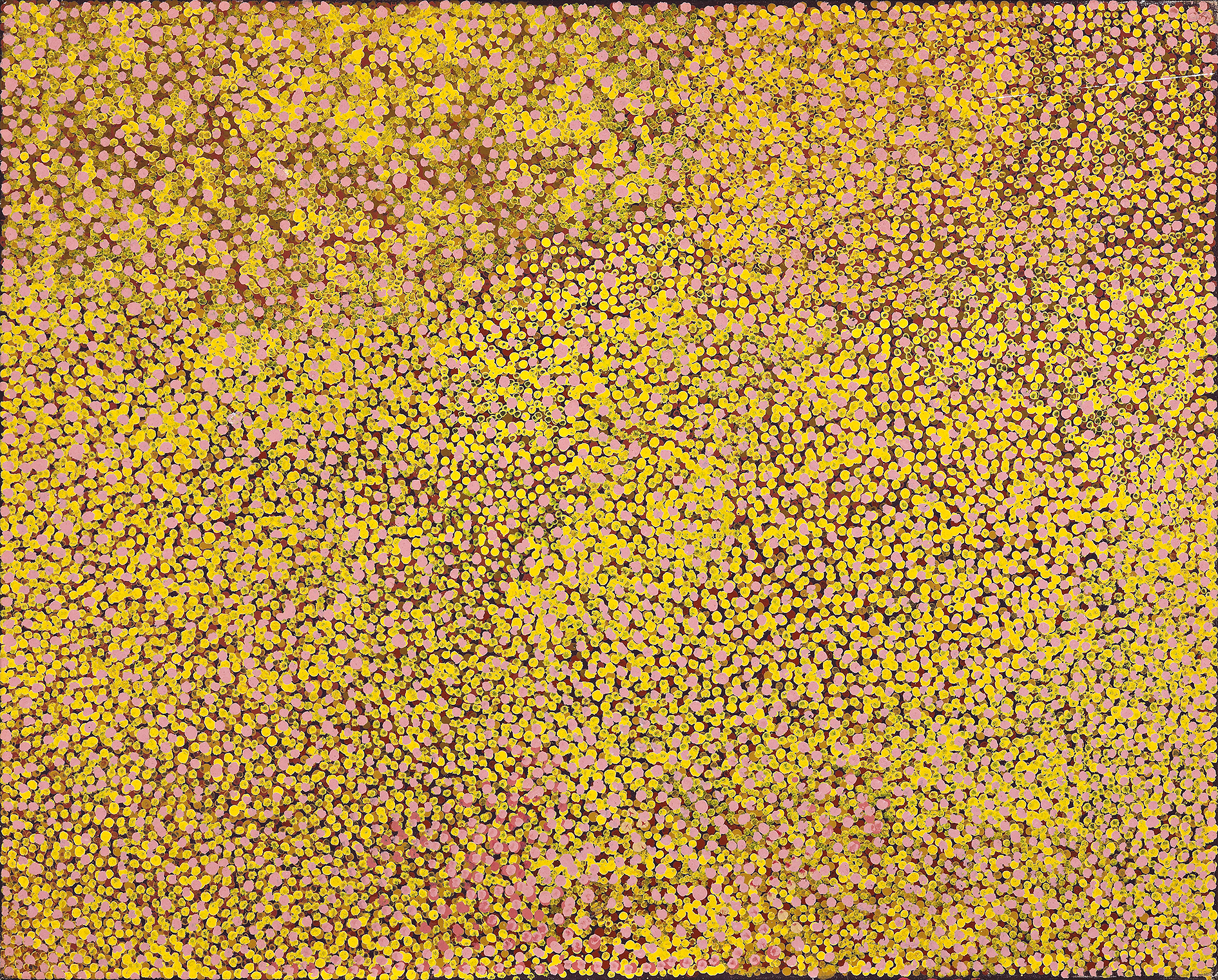 Significantly, Untitled, 1992 was created at a time when Kngwarreye’s painting was itself undergoing a process of transformation, with the artist abandoning the background tracery of the underlying yam roots, a consistent compositional device in her earlier paintings and transitioning instead into fields of pure dots. This was also a time when Kngwarreye experimented with colour and broadened her palette beyond traditional colours and their derivatives, to incorporate brighter hues such as blues, reds, greens, and in this case, vivid yellows and pinks. Kngwarreye suggests not only a sense of delight in the colours of the landscape; rather, now colour itself becomes both the impetus for – and subject of – such paintings.