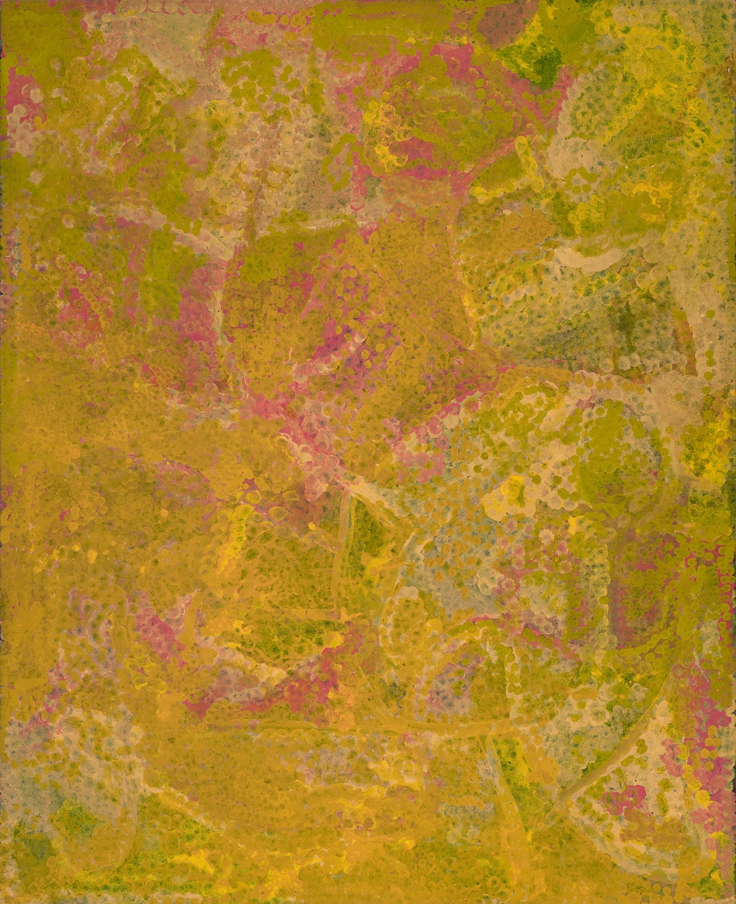 This work is accompanied by a certificate of authenticity from Delmore Gallery, via Alice Springs which states in part: ‘Emily’s country, Alalgura, has many varieties of bush tucker and animals associated with it. Often she will select a tree, vine or fruit bearing plant, whose seed, fruit, leaves and flowers will lie on, above or below the earth and intermingle with the other forms of life in the preferred area. Each work brings an enthusiastic verbal patter about her country.’