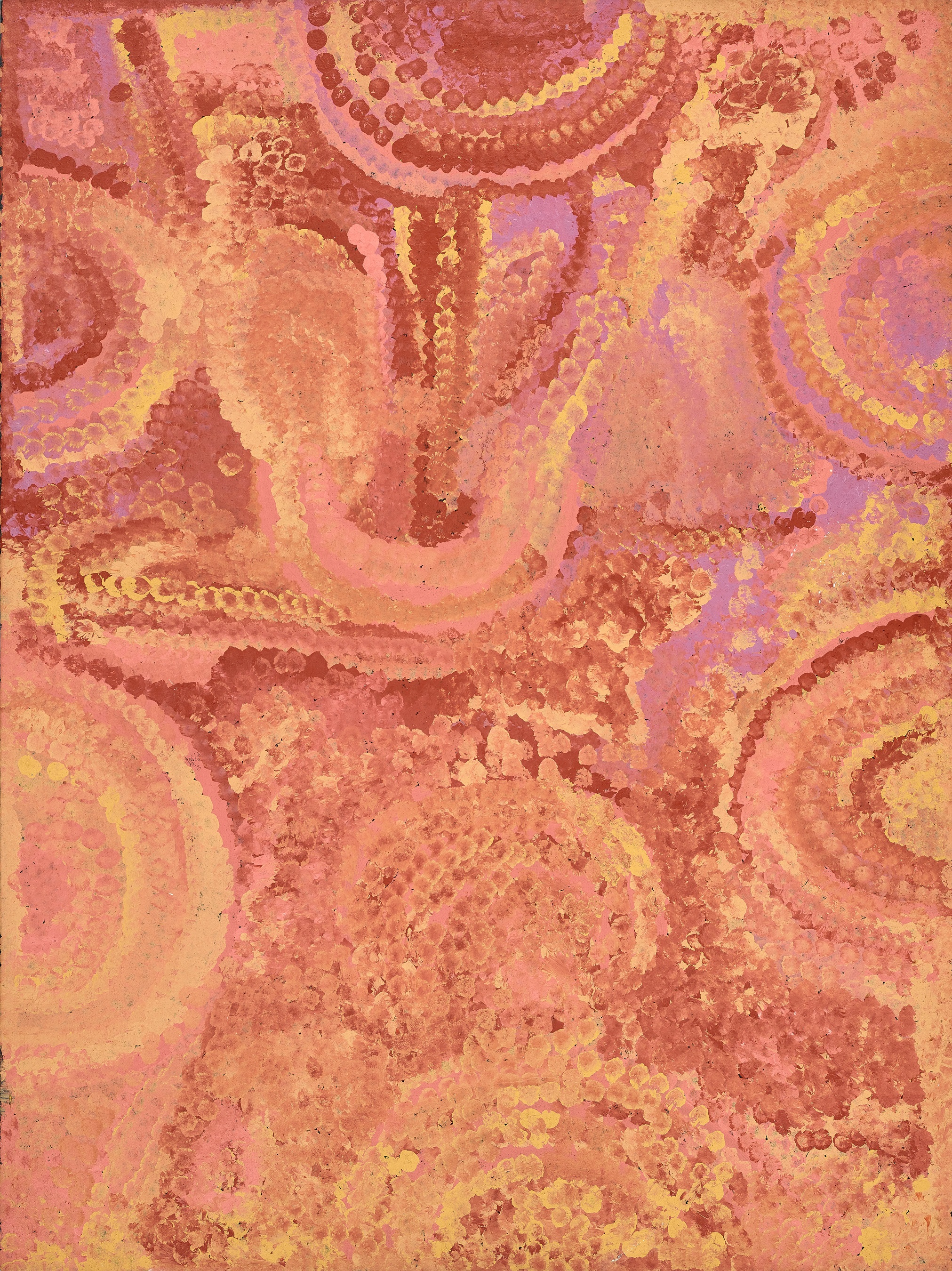 Untitled, 1992 records the cyclical change as desert plants bloom after summer rains. The work is atypical through its repeated semi-circular motif reminiscent of the paintings from Western desert communities further west. These motifs most likely representing the bodies of seated women participating in a ceremony at the artist’s community. Painted in June 1992, with its cascading layers of red, yellow, pink, purple and orange dots, this work is a celebration of nature at its most potent.