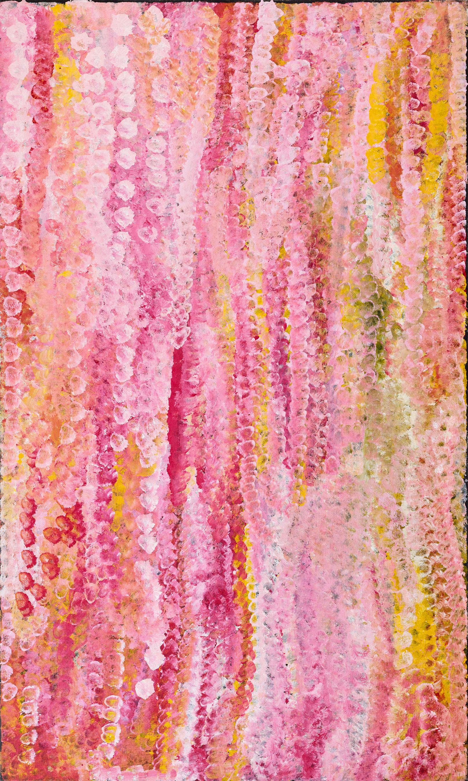 This work is accompanied by a certificate of authenticity from Delmore Gallery which states: ‘This painting ‘Untitled 1994’ by Emily Kame Kngwarreye, is a beautiful expression of carefully crafted textures and colour created by gently placed light-infused dots demonstrating Kngwarreye’s wonderful painterly skill. Her focus is a seasonal one, her painting conveying the dramatic colours of abundance within in the arid lands of north-east of Alice Springs. Kngwarreye leans into her canvas and builds up a landscape loaded with various plums, berries, flowers and seeds, as a celebration of replenishment of her country, and a reminder that colour is a vital indicator of ripeness and availability to harvest. We feel her connection to this surface and linking into those special places where these fruits and seed are located, and of past experiences of being there.’
