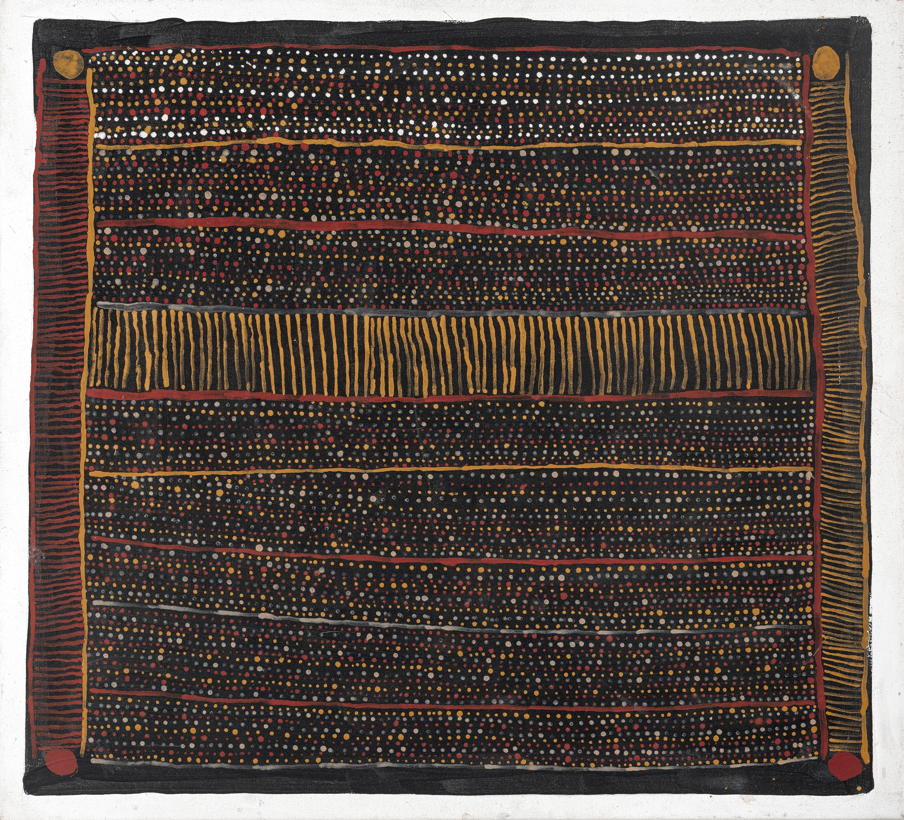 ‘Her poetics of intimacy taught the art world that quality is not contingent upon scale. Her means were few: she needed only dots, lines and ochre colours to create infinite variations of rhythm, balance and beauty, of which no two are exactly alike. Kantilla’s works, like those of early European modernists, do not map space or tell a story, but radically affirm the painted surface and thereby guarantee the autonomy of art. Yet the power and inwardness of Kantilla’s innovative art hinges on its deep resonance with customary ritual. For the viewer, Kantilla’s inescapably modern works are also highly charged with ceremony, with something spiritual and untouchable.