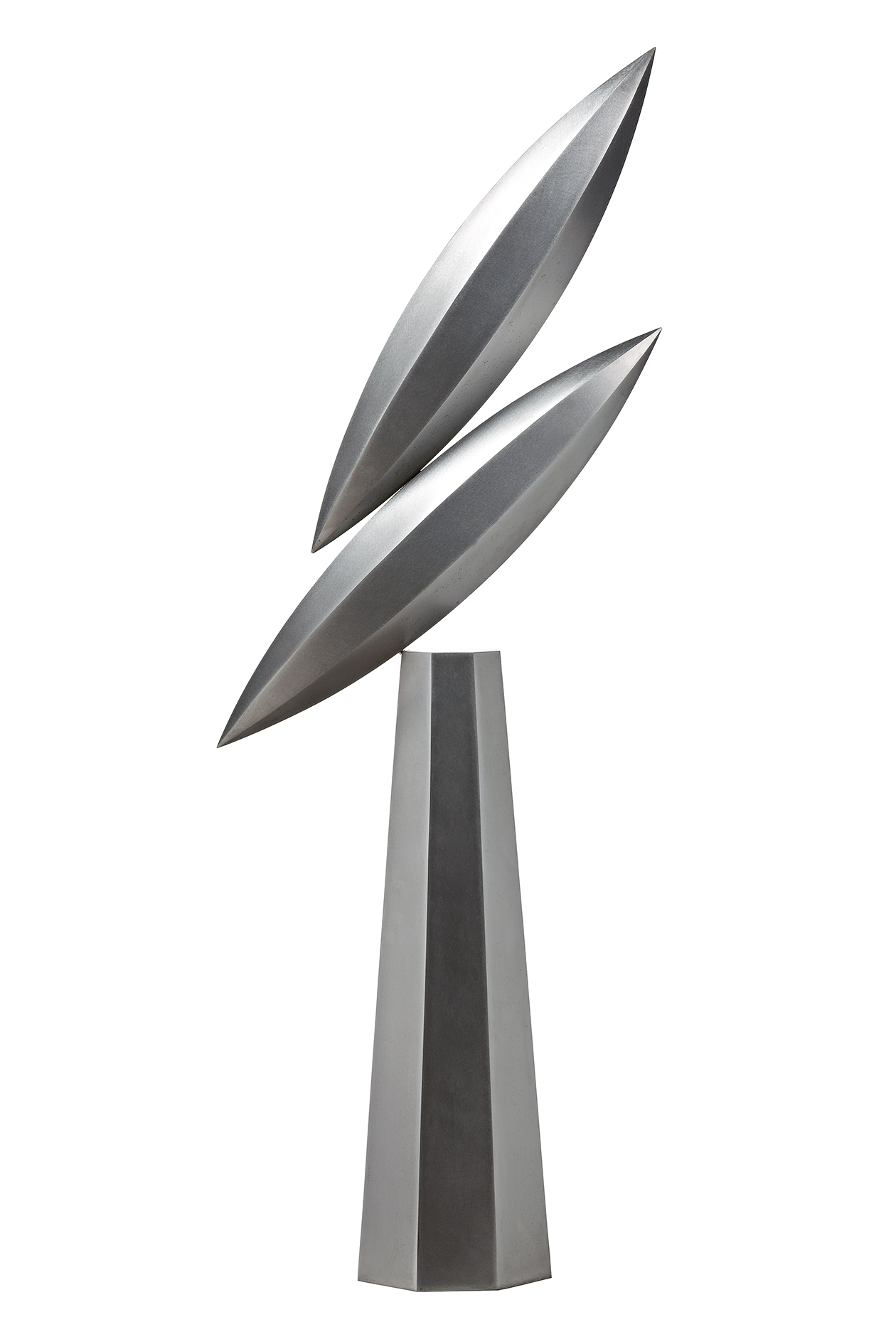 From 1998 to 1999, Makigawa produced smaller scale sculptures motivated by the theme ‘Beginning’, expressing ideas of life, growth and spirituality. ‘Beginning’, comprising of figures of seeds, bowls, and houses, was Makigawa’s final series of works before his passing in December 1999. Widely known throughout his artistic career for his large scale corporate and public commissioned sculptures, Makigawa took an intimate turn in his solo exhibition crafting universal and personal symbols that would evoke reflection and spirituality. Nine Lives exhibited at Anna Schwartz Gallery in Melbourne encapsulated the peaceful elegance of his brushed steel works featuring life symbols including half-seed pods. The figures spread throughout the gallery floor is described as the ‘most elegant and powerful exhibition ... stripped to a formal essence [like] sculptural haikus.’3