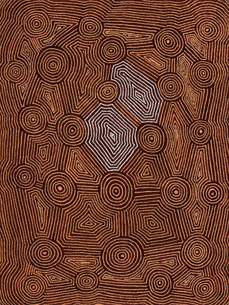 'This painting depicts designs associated with the sand dune site of Yampura Tjungku, just to the west of the Kiwirrkura Community airstrip.