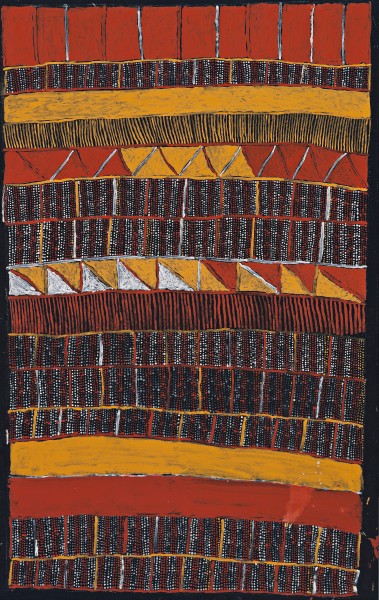 Painted on a black ground, this painting encompasses all the elements of the artist’s lexicon; pwanga (dots), marlipinyini (lines) and turtiyangimari (colours: white, red, yellow and black).