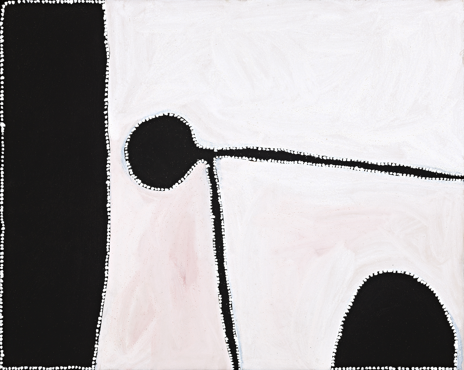 Innovation and experimentation are fundamental to Paddy Bedford's practice as a contemporary artist. The appeal of his work to international audiences and contemporary art collections worldwide rests in part on this sense of continuous innovation that resulted in a new exciting visual vocabulary that does not compromise Gija law and tradition and which resists comparison with modern Western art canons. His formal language, typified by a symbiosis between bold and powerful forms and an elegance and harmony in composition, evokes the rock escarpments and other amorphous features of the Kimberley landscape. 1