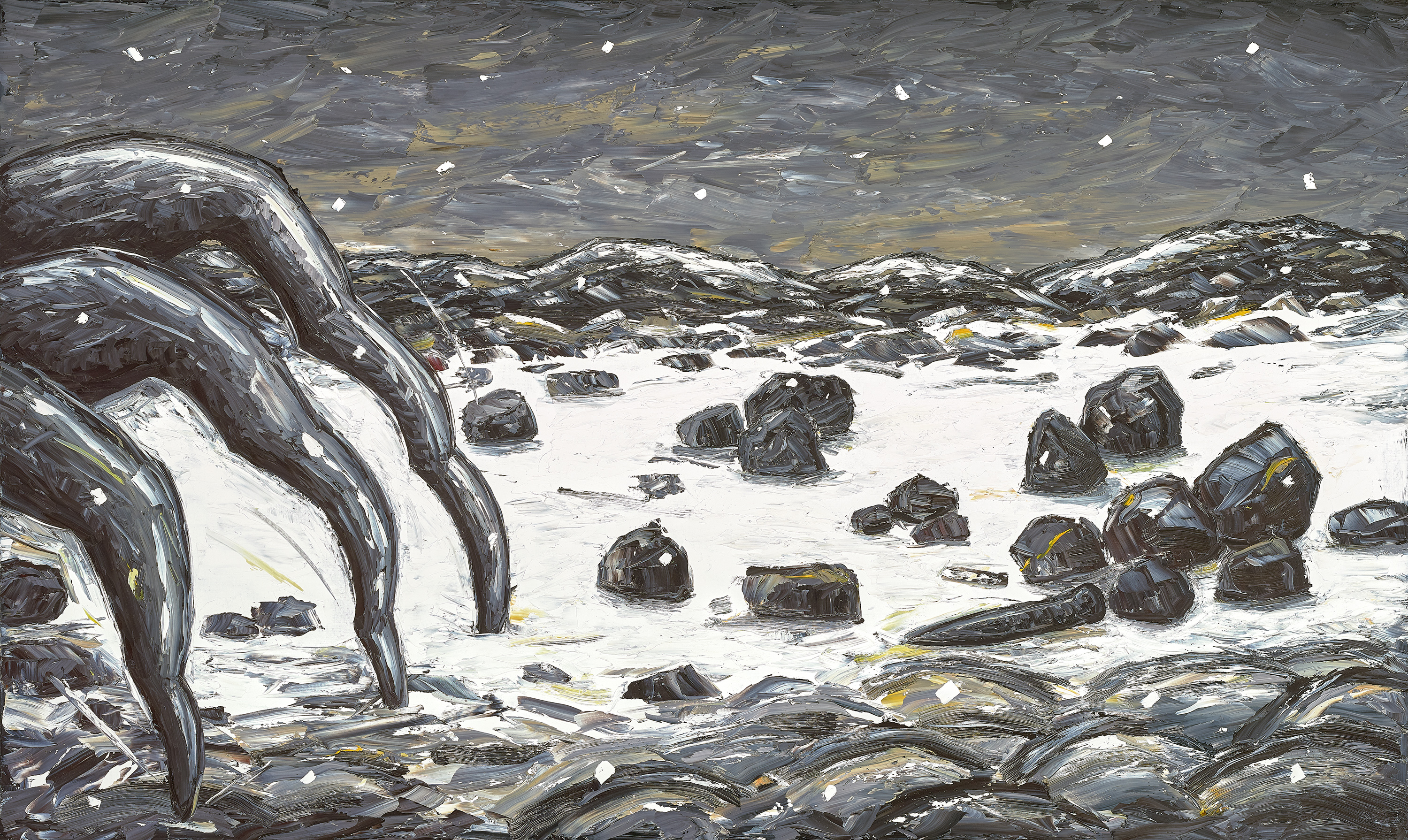 In the winter of 1989, Booth first embarked upon what were to become his celebrated 'snow paintings'. Influenced partly by his childhood years in Sheffield in England's industrial north, these works represented an important transition in the artist’s oeuvre which he paralleled to the journey in Milton's epic sequence of poems, Paradise Lost (1667) to Paradise Regained (1671). More specifically however, the series was inspired by the artist's re-reading of Shakespeare's Macbeth (1606) with its chilling themes of ambition and evil bearing resonance for Booth in contemporary Western greed and its blatant disregard for the planet. Accordingly, in many of these paintings, snow throws a white curtain of silence over a charred and blackened landscape, heralding the end of man's aggression towards his fellow man and the environment, like the omen of destruction foretold by the decimation of the Birnam wood in Macbeth.