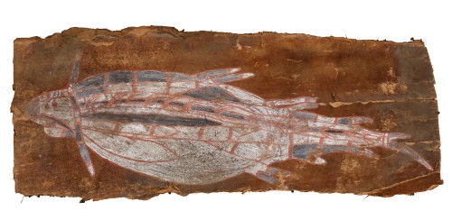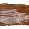 The few extant examples of bark shelter paintings tend to depict ancestral beings, spirits, flora and fauna in a stylized, figurative manner. Some figures are decorated in geometric clan designs, while others in the X-ray style of drawing that is a feature of the pictorial art of West Arnhem Land and the Kakadu region. The spirit figure in lot 11 is painted in this style. The figure appears to be wearing a feathered headdress that associates it with ceremony, and the drawing of the vertebrae suggests three-dimensionality, a type of rendition which is rare in the art of the region. The image of the barramundi in lot 10 is another outstanding example of the X-ray style; here the backbone and some of the internal organs of the fish are clearly defined. Note too that the optic nerves are shown. By way of contrast, the animated figures of the barramundi and the turtles in lot 11 are painted in silhouette and drawn to suggest movement.