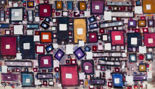 Kemp always had a weighty point he wished to press. Through geometry he wished to convey the perceptions of physicists and scientists, how they discern rational systems behind our seemingly haphazard world, with his overall Sequence paintings conveying the restless turmoil of the cosmos. But this untitled piece has a more direct goal, evoking the built environment around Kemp’s warehouse-studio. The artist teases his audience visually by using geometric forms to hint of what was a city zone under active redevelopment: squares, oblongs and discs strikingly echo an urban grid of inner-city streets, alleyways and buildings viewed from above, each floating white square denoting a skyscraper to be constructed.