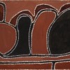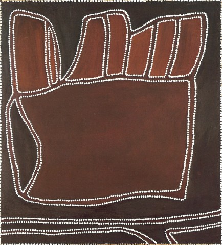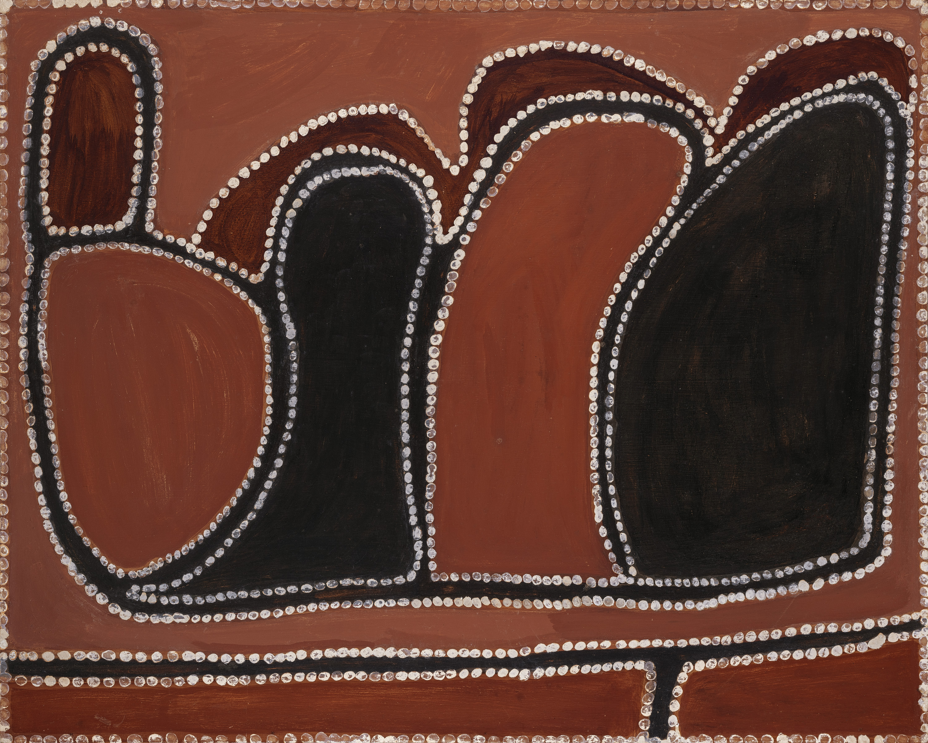 Painted for Waringarri Aboriginal Arts in Kununurra, Untitled, 1986 is characteristic of Rover’s early paintings where layers of traditional pigments affixed with natural resin binders are outlined by a tracery of white dots painted with huntite, a white chalky pigment used in ceremony and rock art. The work shows a planar view of landscape where lines indicate geological features, while at the same time recalling ancestral paths and delineating areas of country.