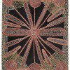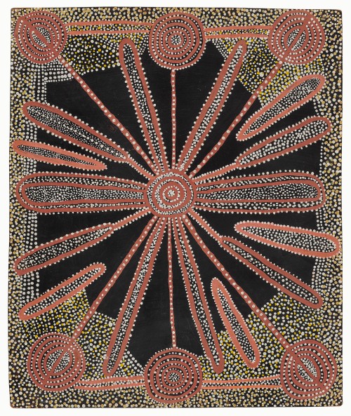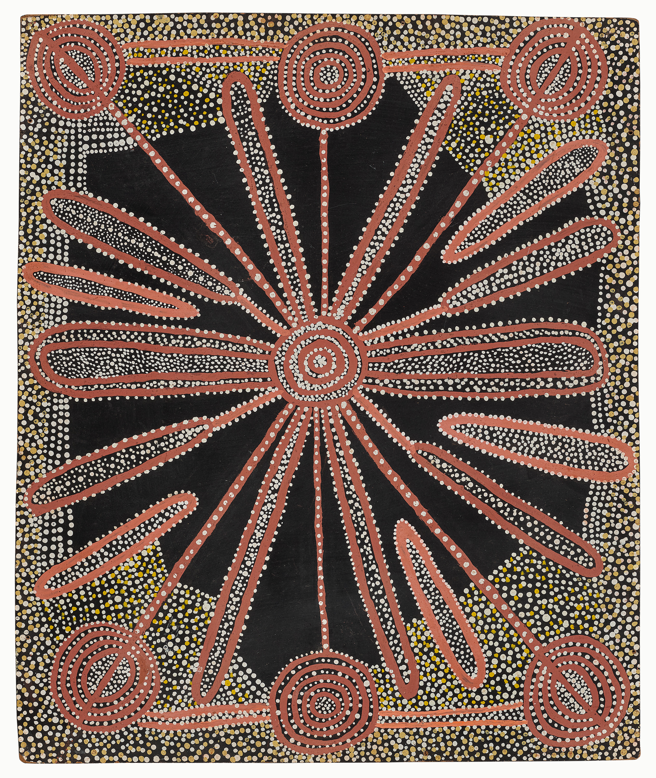 Painted on composition board, Untitled, 1972 relates to such paintings as Old Man Story, 1972, in the collection of the Museum and Art Gallery of the Northern Territory, Darwin – a work which refers to the travels of the mythological Old Man.3 As in that work, Untitled is painted on a black ground with a central roundel linked to roundels at the four corners. Ovoid forms, possibly representing sacred boards, are randomly placed in the composition and left undecorated. The work retains a sense of balance and ancestral geometry devoid of any naturalistic imagery.