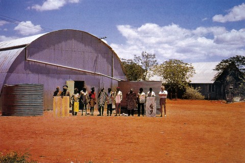 Payungka Tjapangati, with Geoffrey Bardon, outside the